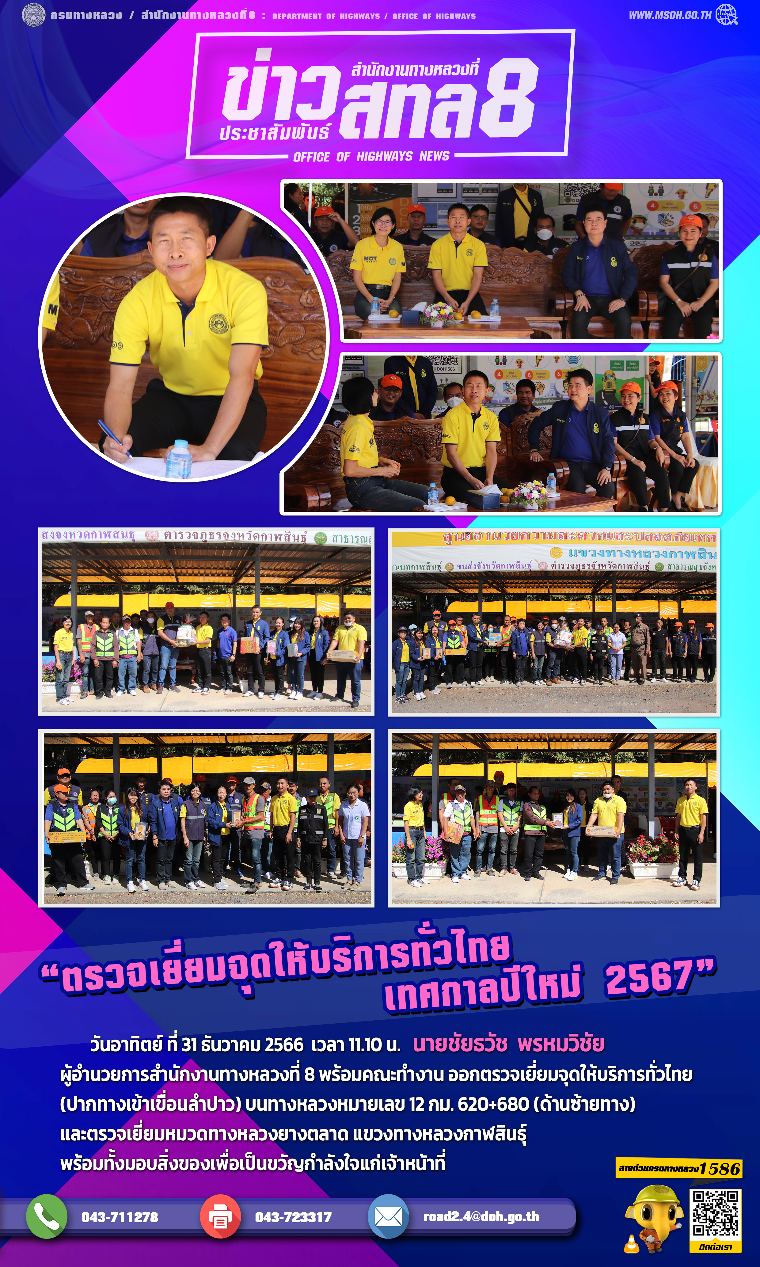 ออกตรวจเยี่ยมจุดให้บริการทั่วไทย (ปากทางเข้าเขื่อนลำปาว) บนทางหลวงหมายเลข 12 กม. 620+680 (ด้านซ้ายทาง) และตรวจเยี่ยมหมวดทางหลวงยางตลาด แขวงทางหลวงกาฬสินธุ์ พร้อมทั้งมอบสิ่งของเพื่อเป็นขวัญกำลังใจแก่เจ้าหน้าที่