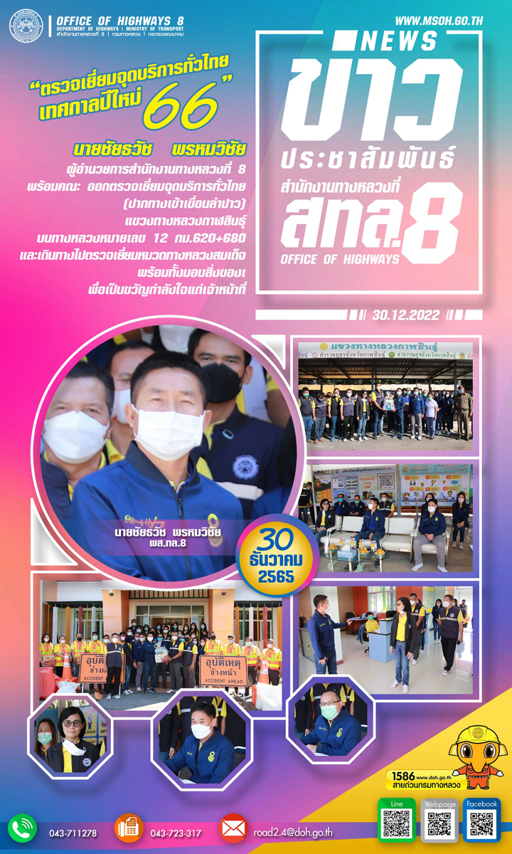 นายชัยธวัช พรหมวิชัย ผู้อำนวยการสำนักงานทางหลวงที่ 8 พร้อมคณะ ออกตรวจเยี่ยมจุดบริการทั่วไทย (ปากทางเข้าเขื่อนลำปาว) แขวงทางหลวงกาฬสินธุ์ บนทางหลวงหมายเลข 12 กม.620+680 และเดินทางไปตรวจเยี่ยมหมวดทางหลวงสมเด็จ พร้อมทั้งมอบสิ่งของเพื่อเป็นขวัญกำลังใจแก่เจ้าหน้าที่