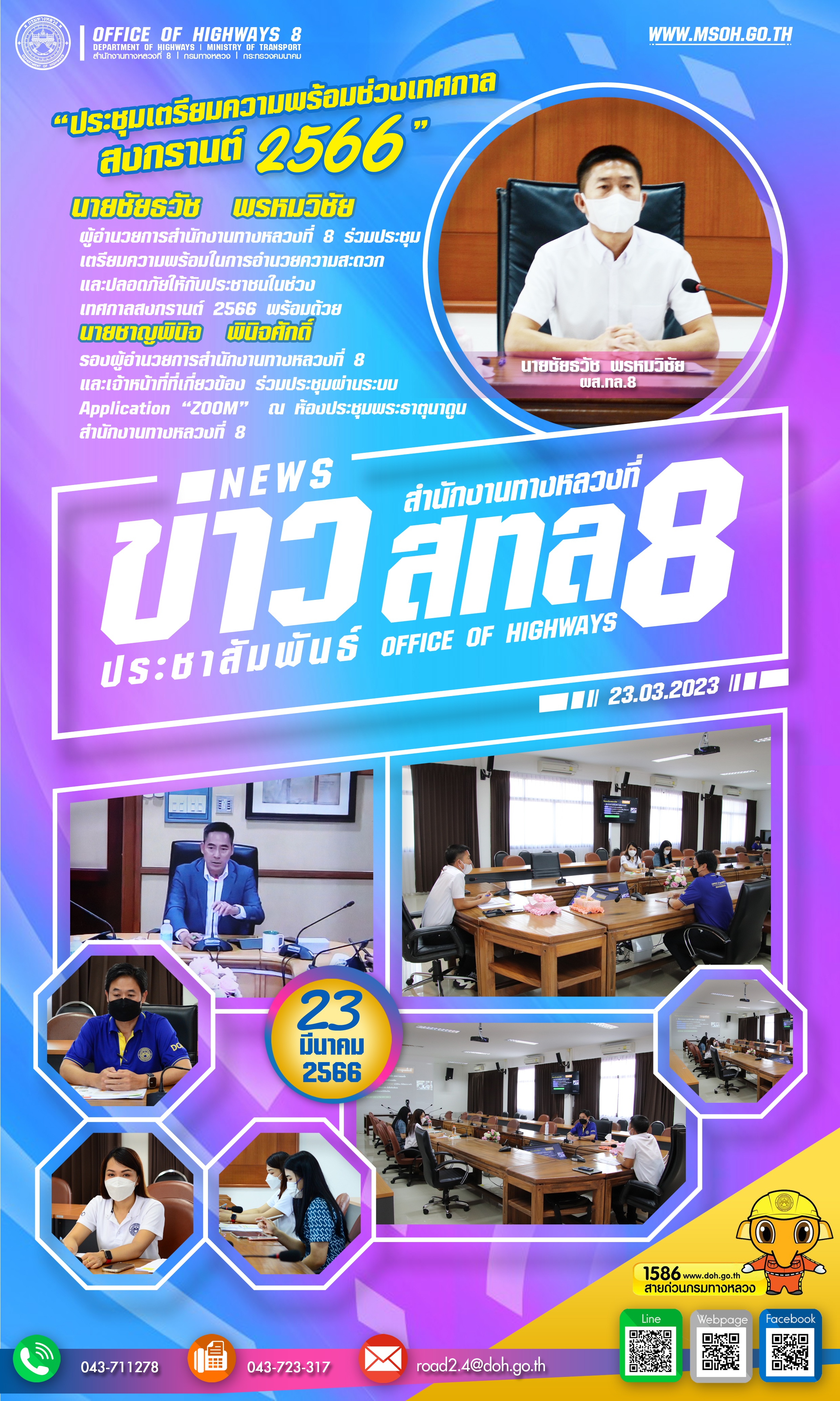 นายชัยธวัช พรหมวิชัย ผู้อำนวยการสำนักงานทางหลวงที่ 8 ร่วมประชุมเตรียมความพร้อมในการอำนวยความสะดวกและปลอดภัยให้กับประชาชนในช่วงเทศกาลสงกรานต์ 2566 พร้อมด้วย นายชาญพินิจ พินิจศักดิ์ รองผู้อำนวยการสำนักงานทางหลวงที่ 8 และเจ้าหน้าที่ที่เกี่ยวข้อง ร่วมประชุมผ่านระบบ Application “ZOOM” ณ ห้องประชุมพระธาตุนาดูน สำนักงานทางหลวงที่ 8