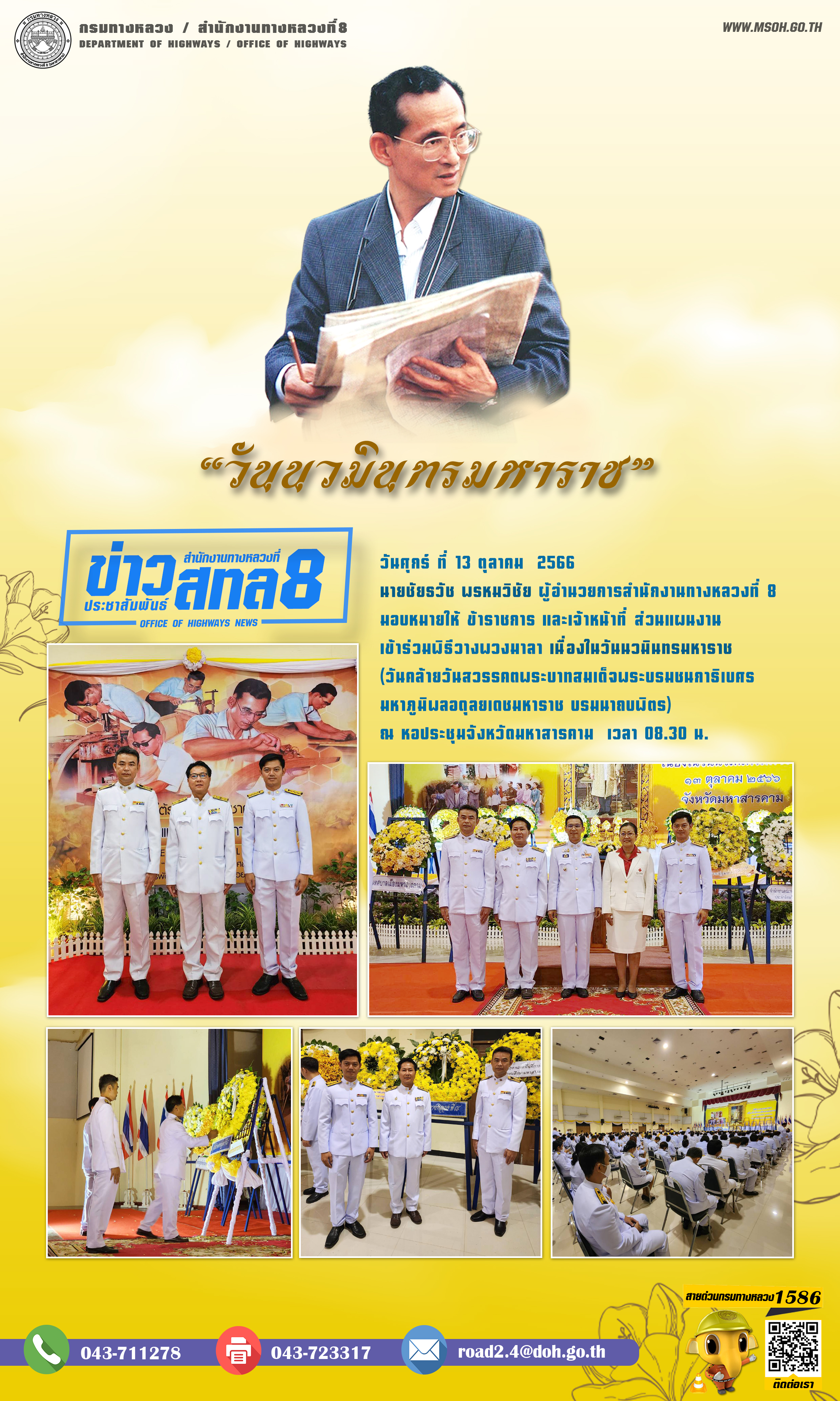 วันศุกร์ ที่ 13 ตุลาคม 2566 นายชัยธวัช พรหมวิชัย ผู้อำนวยการสำนักงานทางหลวงที่ 8 มอบหมายให้ ข้าราชการ และเจ้าหน้าที่ ส่วนแผนงาน เข้าร่วมพิธีวางพวงมาลา เนื่องในวันนวมินทรมหาราช (วันคล้ายวันสวรรคตพระบาทสมเด็จพระบรมชนกาธิเบศร มหาภูมิพลอดุลยเดชมหาราช บรมนาถบพิตร) ณ หอประชุมจังหวัดมหาสารคาม เวลา 08.30 น.