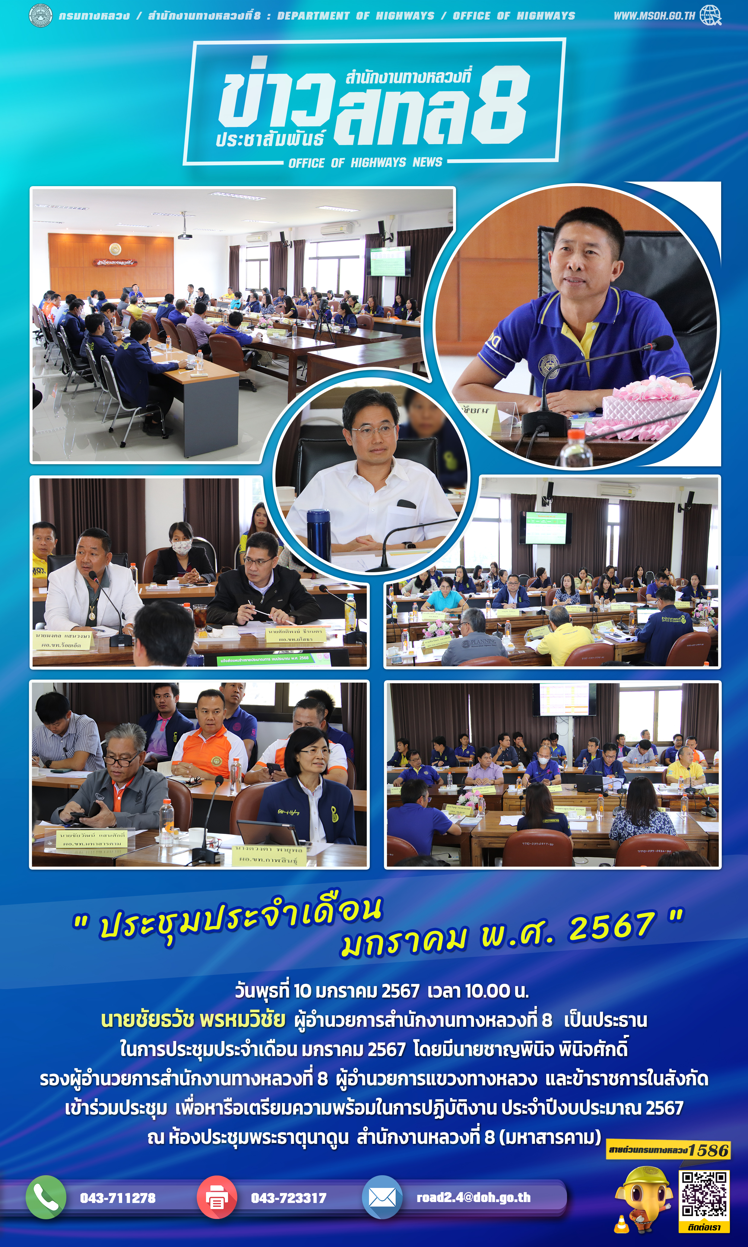 วันพุธที่ 10 มกราคม 2567 เวลา 10.00 น. นายชัยธวัช พรหมวิชัย ผู้อำนวยการสำนักงานทางหลวงที่ 8 เป็นประธานในการประชุมประจำเดือน มกราคม 2567 โดยมีนายชาญพินิจ พินิจศักดิ์ รองผู้อำนวยการสำนักงานทางหลวงที่ 8 ผู้อำนวยการแขวงทางหลวง และข้าราชการในสังกัด เข้าร่วมประชุม เพื่อหารือเตรียมความพร้อมในการปฏิบัติงาน ประจำปีงบประมาณ 2567 ณ ห้องประชุมพระธาตุนาดูน สำนักงานหลวงที่ 8 (มหาสารคาม)
