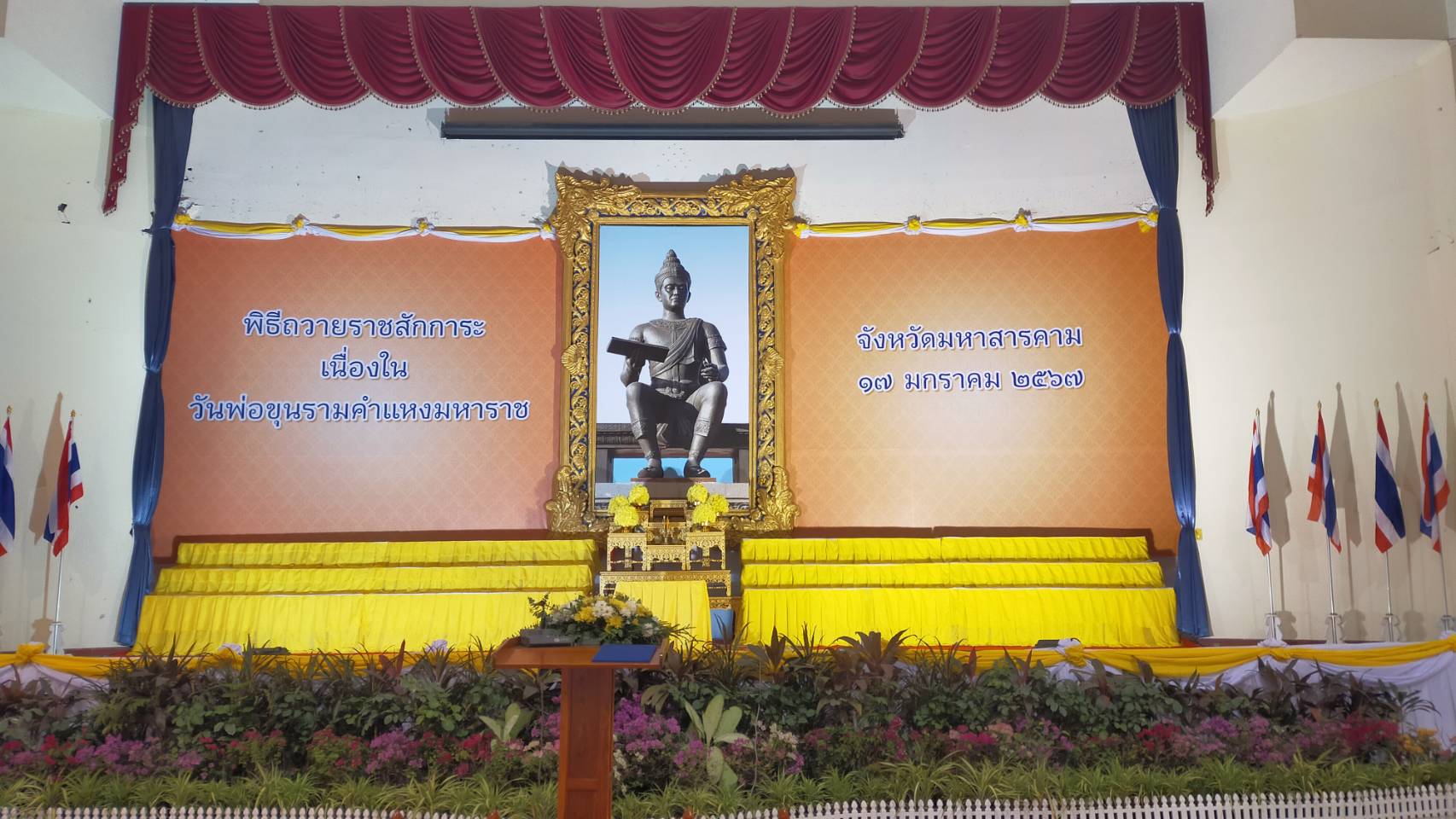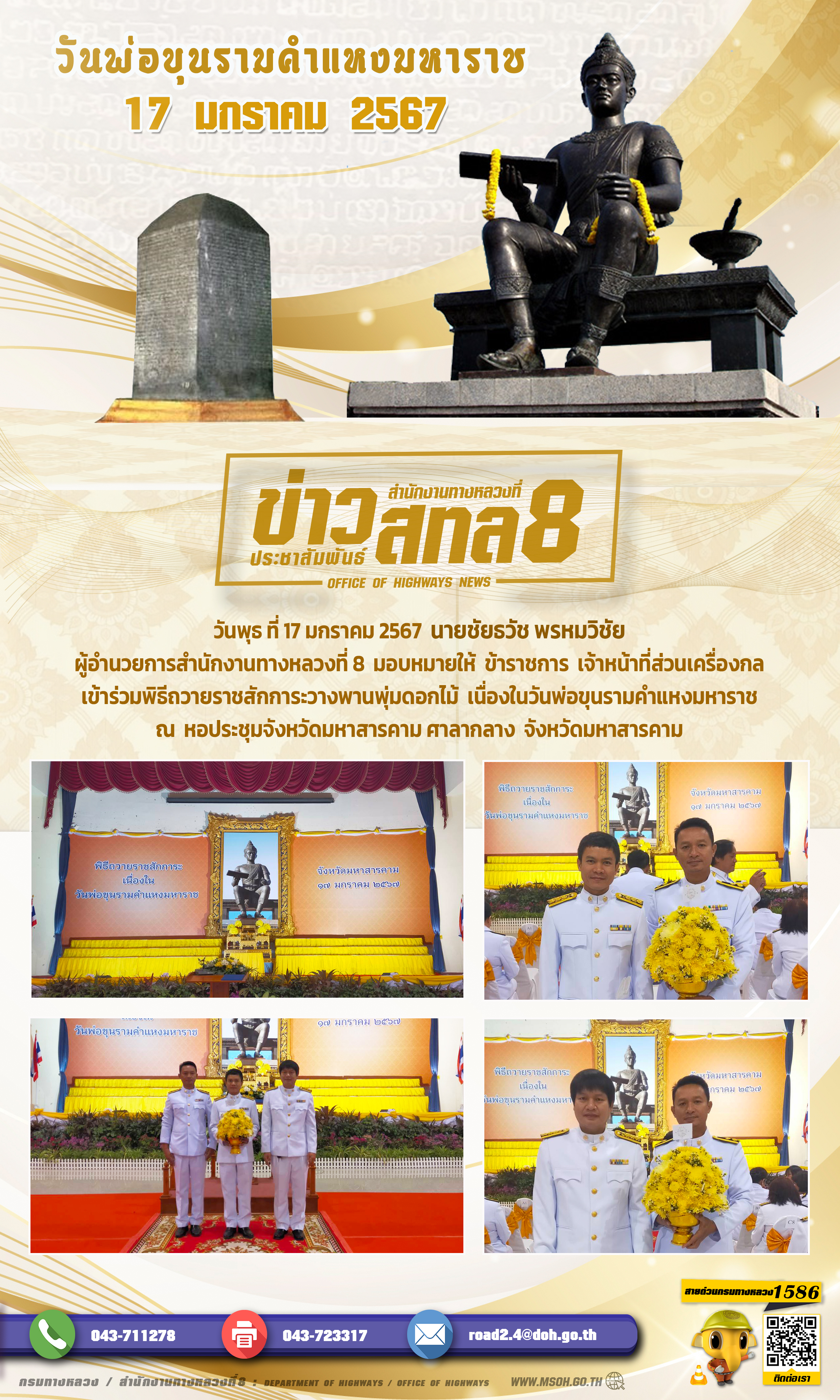 วันพุธ ที่ 17 มกราคม 2567 นายชัยธวัช พรหมวิชัย ผู้อำนวยการสำนักงานทางหลวงที่ 8 มอบหมายให้ ข้าราชการ เจ้าหน้าที่ส่วนเครื่องกล เข้าร่วมพิธีถวายราชสักการะวางพานพุ่มดอกไม้ เนื่องในวันพ่อขุนรามคำแหงมหาราช ณ หอประชุมจังหวัดมหาสารคาม ศาลากลางจังหวัดมหาสารคาม