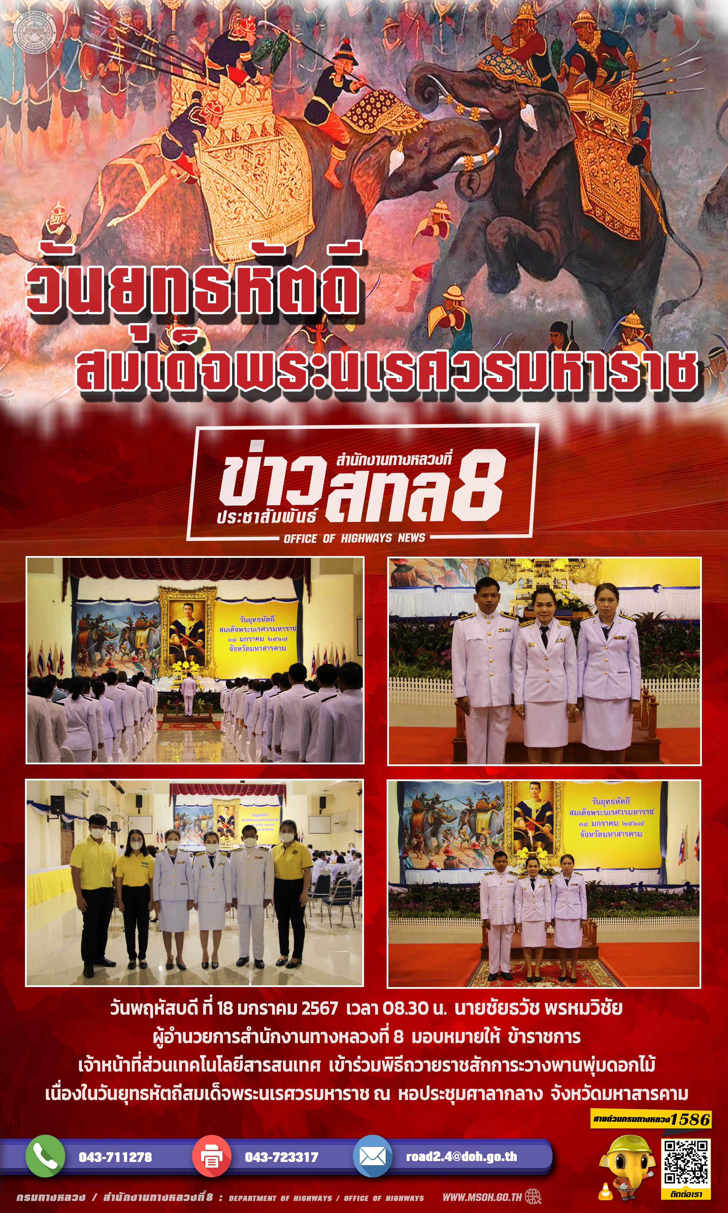 วันพฤหัสบดี ที่ 18 มกราคม 2567 เวลา 08.30 น. นายชัยธวัช พรหมวิชัย ผู้อำนวยการสำนักงานทางหลวงที่ 8 มอบหมายให้ ข้าราชการ เจ้าหน้าที่ส่วนเทคโนโลยีสารสนเทศ เข้าร่วมพิธีถวายราชสักการะวางพานพุ่มดอกไม้ เนื่องในวันยุทธหัตถีสมเด็จพระนเรศวรมหาราช ณ หอประชุมศาลากลาง จังหวัดมหาสารคาม
