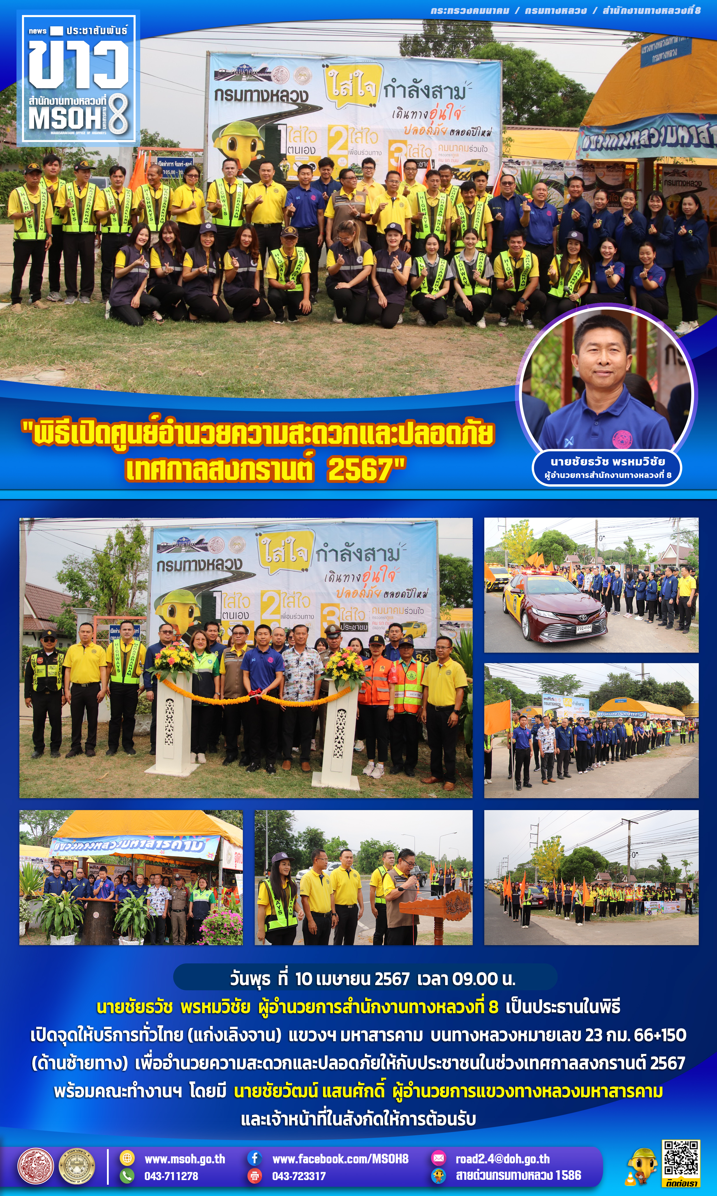 วันพุธ ที่ 10 เมษายน 2567 เวลา 09.00 น. นายชัยธวัช พรหมวิชัย ผู้อำนวยการสำนักงานทางหลวงที่ 8 เป็นประธานในพิธีเปิดจุดให้บริการทั่วไทย (แก่งเลิงจาน) แขวงฯ มหาสารคาม บนทางหลวงหมายเลข 23 กม. 66+150 (ด้านซ้ายทาง) เพื่ออำนวยความสะดวกและปลอดภัยให้กับประชาชนในช่วงเทศกาลสงกรานต์ 2567 พร้อมคณะทำงานฯ โดยมี นายชัยวัฒน์ แสนศักดิ์ิ์ ผู้อำนวยการแขวงทางหลวงมหาสารคาม และเจ้าหน้าที่ในสังกัดให้การต้อนรับ