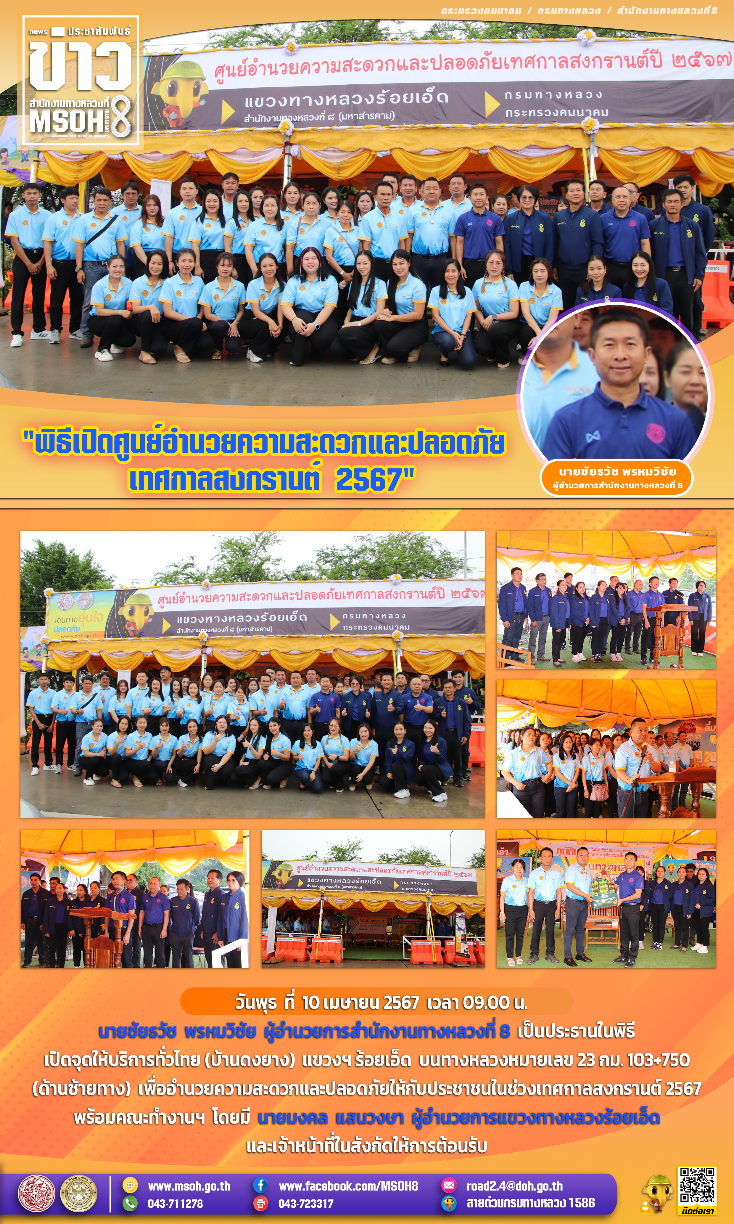 วันพุธ ที่ 10 เมษายน 2567 เวลา 09.00 น. นายชัยธวัช พรหมวิชัย ผู้อำนวยการสำนักงานทางหลวงที่ 8 เป็นประธานในพิธีเปิดจุดให้บริการทั่วไทย (บ้านดงยาง) แขวงฯ ร้อยเอ็ด บนทางหลวงหมายเลข 23 กม. 103+750 (ด้านซ้ายทาง) เพื่ออำนวยความสะดวกและปลอดภัยให้กับประชาชนในช่วงเทศกาลสงกรานต์ 2567 พร้อมคณะทำงานฯ โดยมี นายมงคล แสนวงษา ผู้อำนวยการแขวงทางหลวงร้อยเอ็ดและเจ้าหน้าที่ในสังกัดให้การต้อนรับ