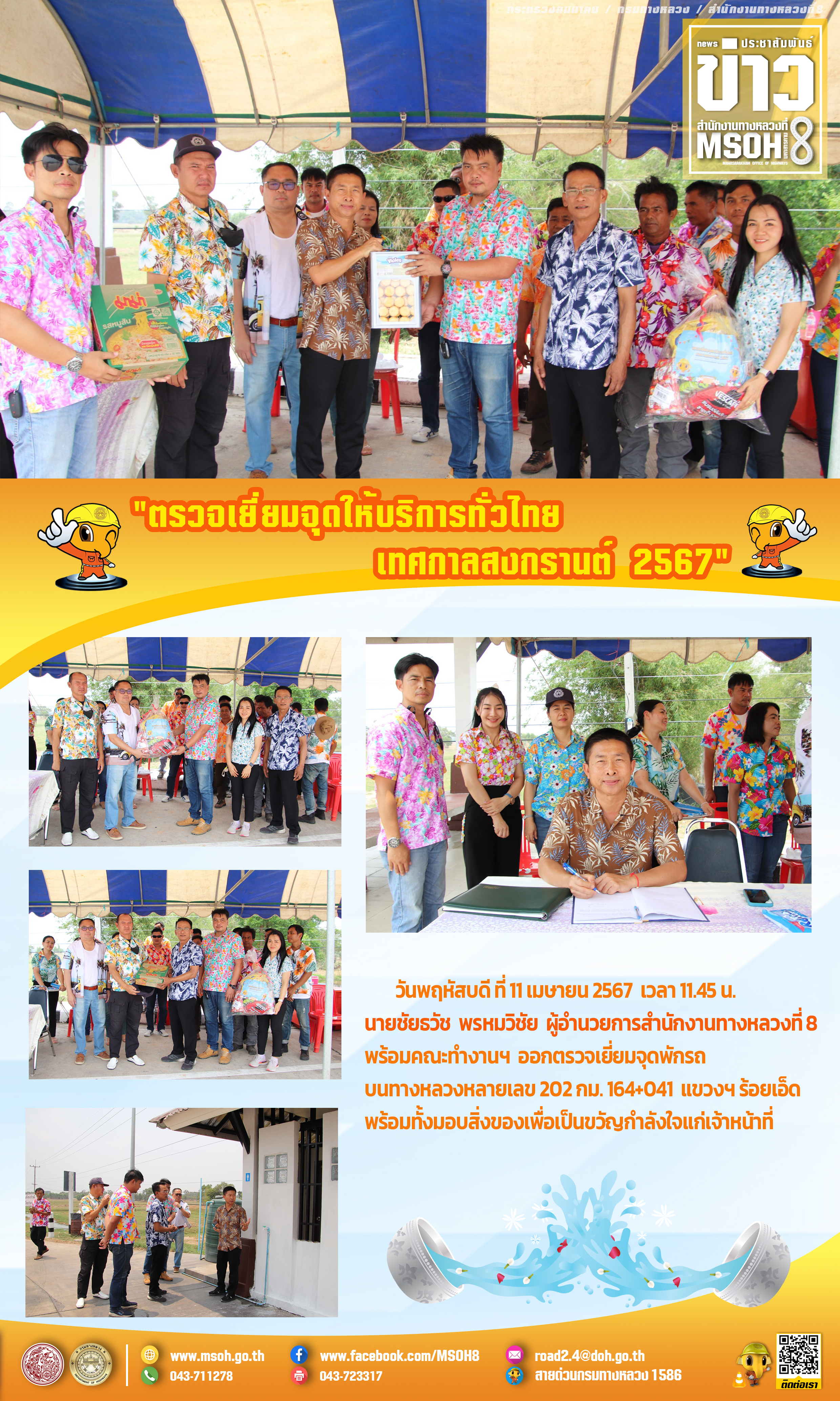 วันพฤหัสบดี ที่ 11 เมษายน 2567 เวลา 11.45 น. นายชัยธวัช พรหมวิชัย ผู้อำนวยการสำนักงานทางหลวงที่ 8 พร้อมคณะทำงานฯ ออกตรวจเยี่ยมจุดพักรถ บนทางหลวงหลายเลข 202 กม. 164+041 แขวงฯ ร้อยเอ็ด พร้อมทั้งมอบสิ่งของเพื่อเป็นขวัญกำลังใจแก่เจ้าหน้าที่