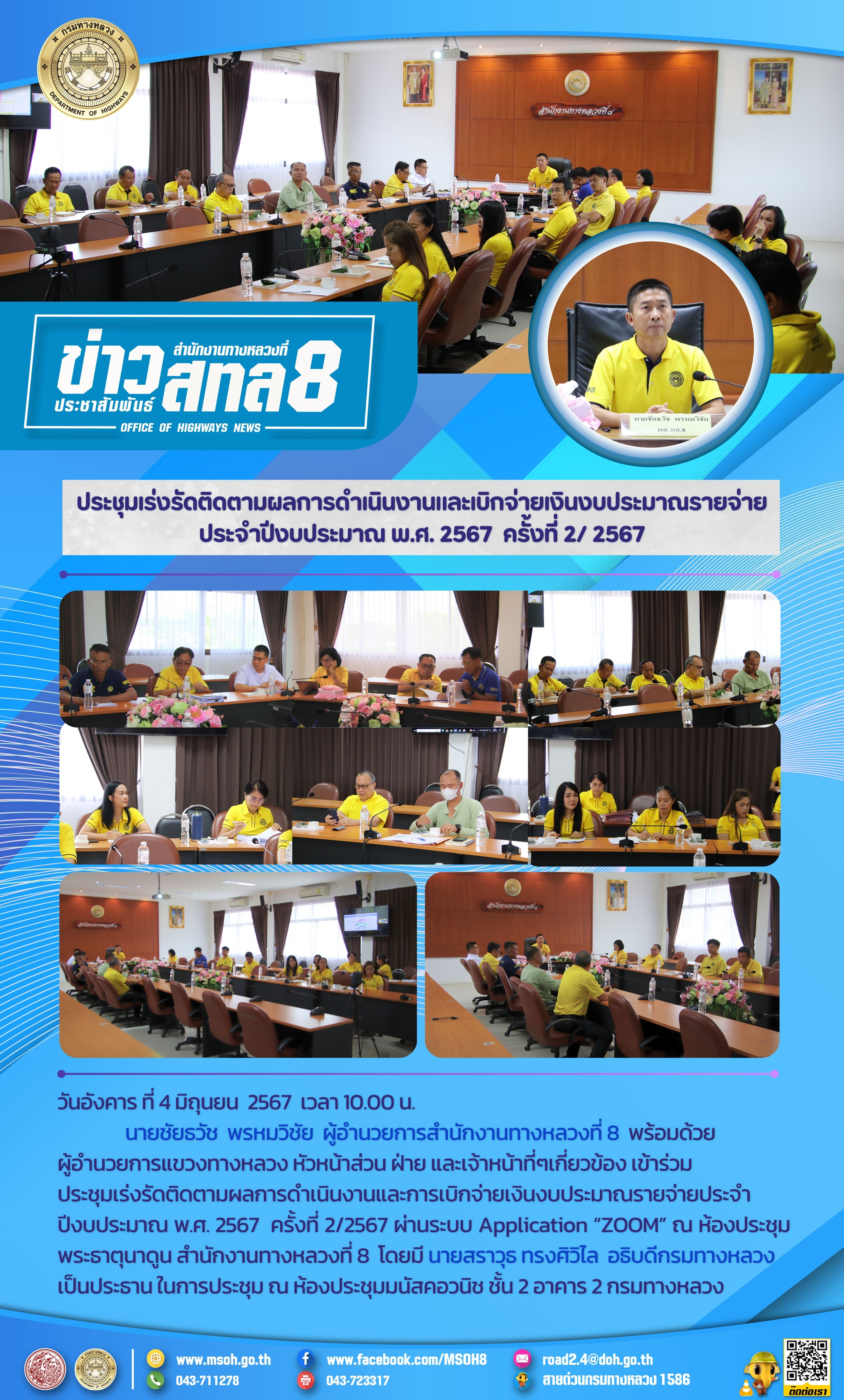 วันอังคาร ที่ 4 มิถุนยน 2567 เวลา 10.00 น. นายชัยธวัช พรหมวิชัย ผู้อำนวยการสำนักงานทางหลวงที่ 8 พร้อมด้วยผู้อำนวยการแขวงทางหลวง หัวหน้าส่วน ฝ่าย และเจ้าหน้าที่ๆเกี่ยวข้อง เข้าร่วมประชุมเร่งรัดติดตามผลการดำเนินงานและการเบิกจ่ายเงินงบประมาณรายจ่ายประจำปีงบประมาณ พ.ศ. 2567 ครั้งที่ 2/2567 ผ่านระบบ Application “ZOOM” ณ ห้องประชุมพระธาตุนาดูน สำนักงานทางหลวงที่ 8 โดยมี นายสราวุธ ทรงศิวิไล อธิบดีกรมทางหลวง เป็นประธาน ในการประชุม ณ ห้องประชุมมนัสคอวนิช ชั้น 2 อาคาร 2 กรมทางหลวง
