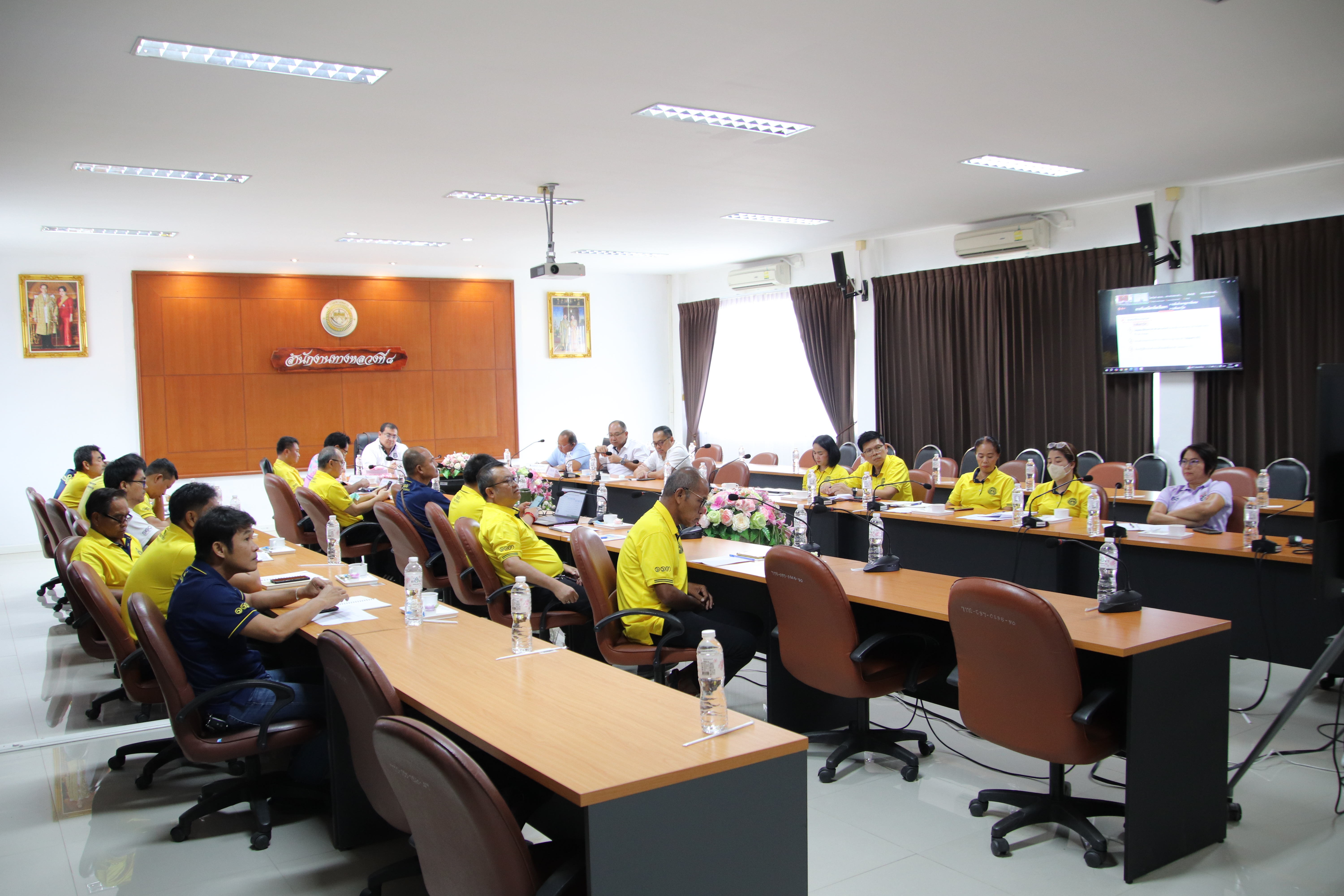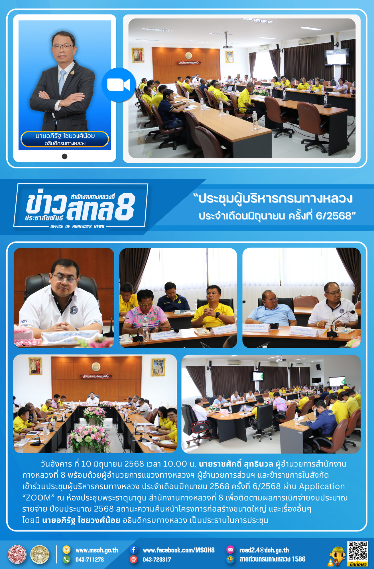 วันอังคาร ที่ 10 มิถุนายน 2568 เวลา 10.00 น. นายราชศักดิ์ สุทธินวล ผู้อำนวยการสำนักงานทางหลวงที่ 8 พร้อมด้วยผู้อำนวยการแขวงทางหลวงฯ ผู้อำนวยการส่วนฯ และข้าราชการในสังกัด เข้าร่วมประชุมผู้บริหารกรมทางหลวง ประจำเดือนมิถุนายน 2568 ครั้งที่ 6/2568 ผ่าน Application “ZOOM” ณ ห้องประชุมพระธาตุนาดูน สำนักงานทางหลวงที่ 8 เพื่อติดตามผลการเบิกจ่ายงบประมาณรายจ่าย ปีงบประมาณ 2568 สถานะความคืบหน้าโครงการก่อสร้างขนาดใหญ่ และเรื่องอื่นๆ โดยมี นายอภิรัฐ ไชยวงศ์น้อย อธิบดีกรมทางหลวง เป็นประธานในการประชุม