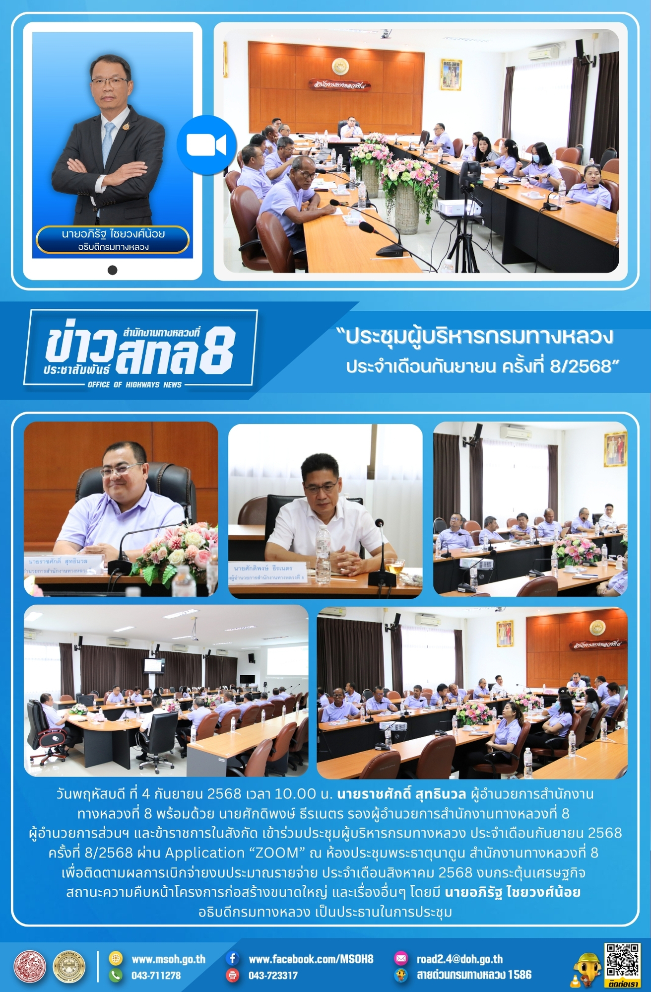 วันพฤหัสบดี ที่ 4 กันยายน 2568 เวลา 10.00 น. นายราชศักดิ์ สุทธินวล ผู้อำนวยการสำนักงานทางหลวงที่ 8 พร้อมด้วย นายศักดิพงษ์ ธีรเนตร รองผู้อำนวยการสำนักงานทางหลวงที่ 8 ผู้อำนวยการส่วนฯ และข้าราชการในสังกัด เข้าร่วมประชุมผู้บริหารกรมทางหลวง ประจำเดือนกันยายน 2568 ครั้งที่ 8/2568 ผ่าน Application “ZOOM” ณ ห้องประชุมพระธาตุนาดูน สำนักงานทางหลวงที่ 8 เพื่อติดตามผลการเบิกจ่ายงบประมาณรายจ่าย ประจำเดือนสิงหาคม 2568 งบกระตุ้นเศรษฐกิจสถานะความคืบหน้าโครงการก่อสร้างขนาดใหญ่ และเรื่องอื่นๆ โดยมี นายอภิรัฐ ไชยวงศ์น้อย อธิบดีกรมทางหลวง เป็นประธานในการประชุม