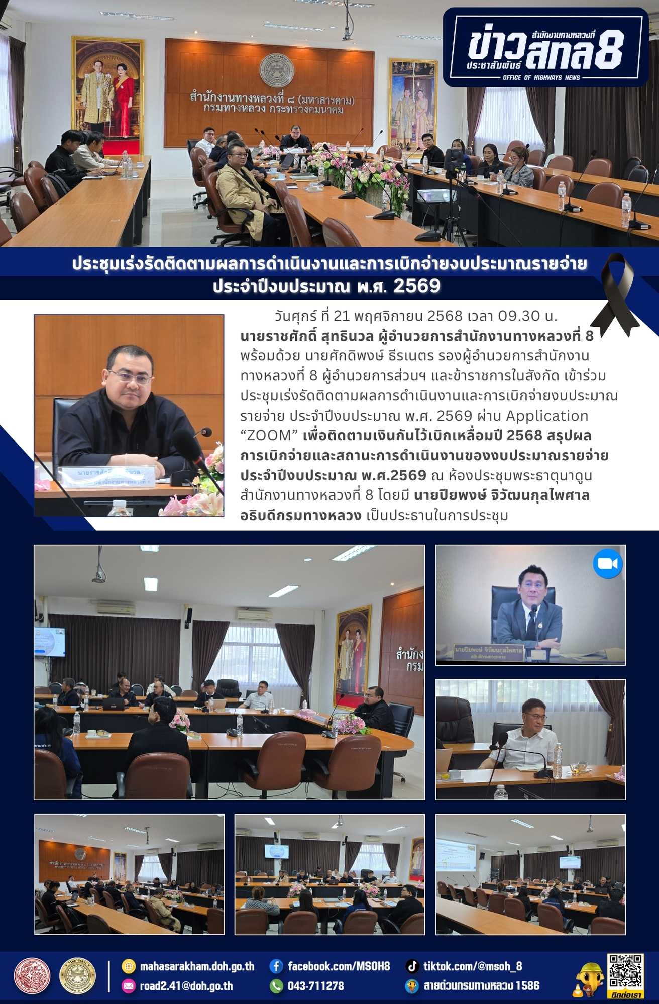 วันศุกร์ ที่ 21 พฤศจิกายน 2568 เวลา 09.30 น. นายราชศักดิ์ สุทธินวล ผู้อำนวยการสำนักงานทางหลวงที่ 8 พร้อมด้วย นายศักดิพงษ์ ธีรเนตร รองผู้อำนวยการสำนักงานทางหลวงที่ 8 ผู้อำนวยการส่วนฯ และข้าราชการในสังกัด เข้าร่วมประชุมเร่งรัดติดตามผลการดำเนินงานและการเบิกจ่ายงบประมาณรายจ่าย ประจำปีงบประมาณ พ.ศ. 2569 ผ่าน Application “ZOOM” เพื่อติดตามเงินกันไว้เบิกเหลื่อมปี 2568 สรุปผลการเบิกจ่ายและสถานะการดำเนินงานของงบประมาณรายจ่ายประจำปีงบประมาณ พ.ศ.2569 ณ ห้องประชุมพระธาตุนาดูน สำนักงานทางหลวงที่ 8 โดยมี นายปิยพงษ์ จิวัฒนกุลไพศาล อธิบดีกรมทางหลวง เป็นประธานในการประชุม