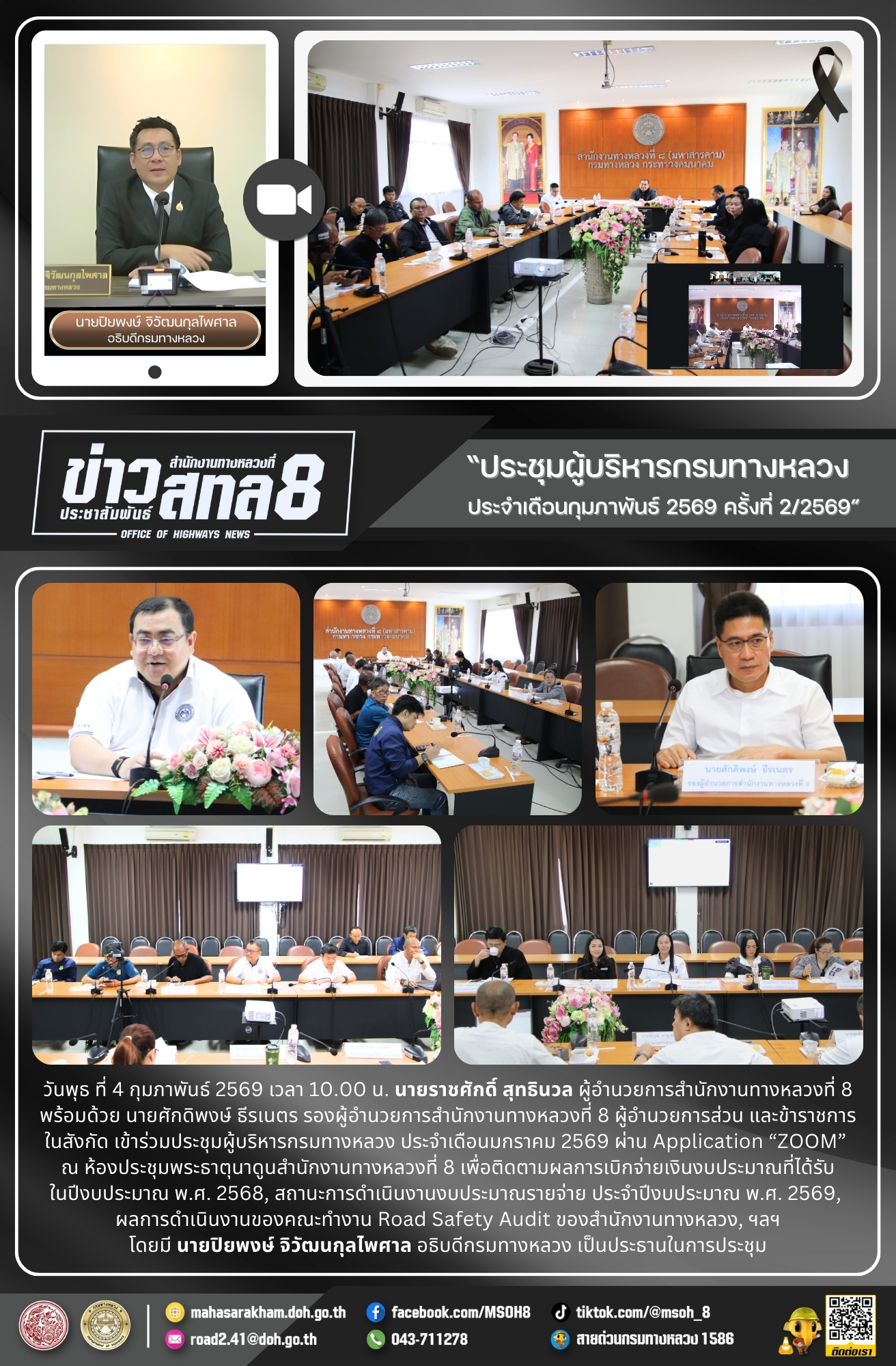วันพุธ ที่ 4 กุมภาพันธ์ 2569 เวลา 10.00 น. นายราชศักดิ์ สุทธินวล ผู้อำนวยการสำนักงานทางหลวงที่ 8 พร้อมด้วย นายศักดิพงษ์ ธีรเนตร รองผู้อำนวยการสำนักงานทางหลวงที่ 8 ผู้อำนวยการส่วน และข้าราชการในสังกัด เข้าร่วมประชุมผู้บริหารกรมทางหลวง ประจำเดือนมกราคม 2569 ผ่าน Application “ZOOM”ณ ห้องประชุมพระธาตุนาดูนสำนักงานทางหลวงที่ 8 เพื่อติดตามผลการเบิกจ่ายเงินงบประมาณที่ได้รับในปีงบประมาณ พ.ศ. 2568, สถานะการดำเนินงานงบประมาณรายจ่าย ประจำปีงบประมาณ พ.ศ. 2569, ผลการดำเนินงานของคณะทำงาน Road Safety Audit ของสำนักงานทางหลวง, ฯลฯ โดยมี นายปิยพงษ์ จิวัฒนกุลไพศาล อธิบดีกรมทางหลวง เป็นประธานในการประชุม