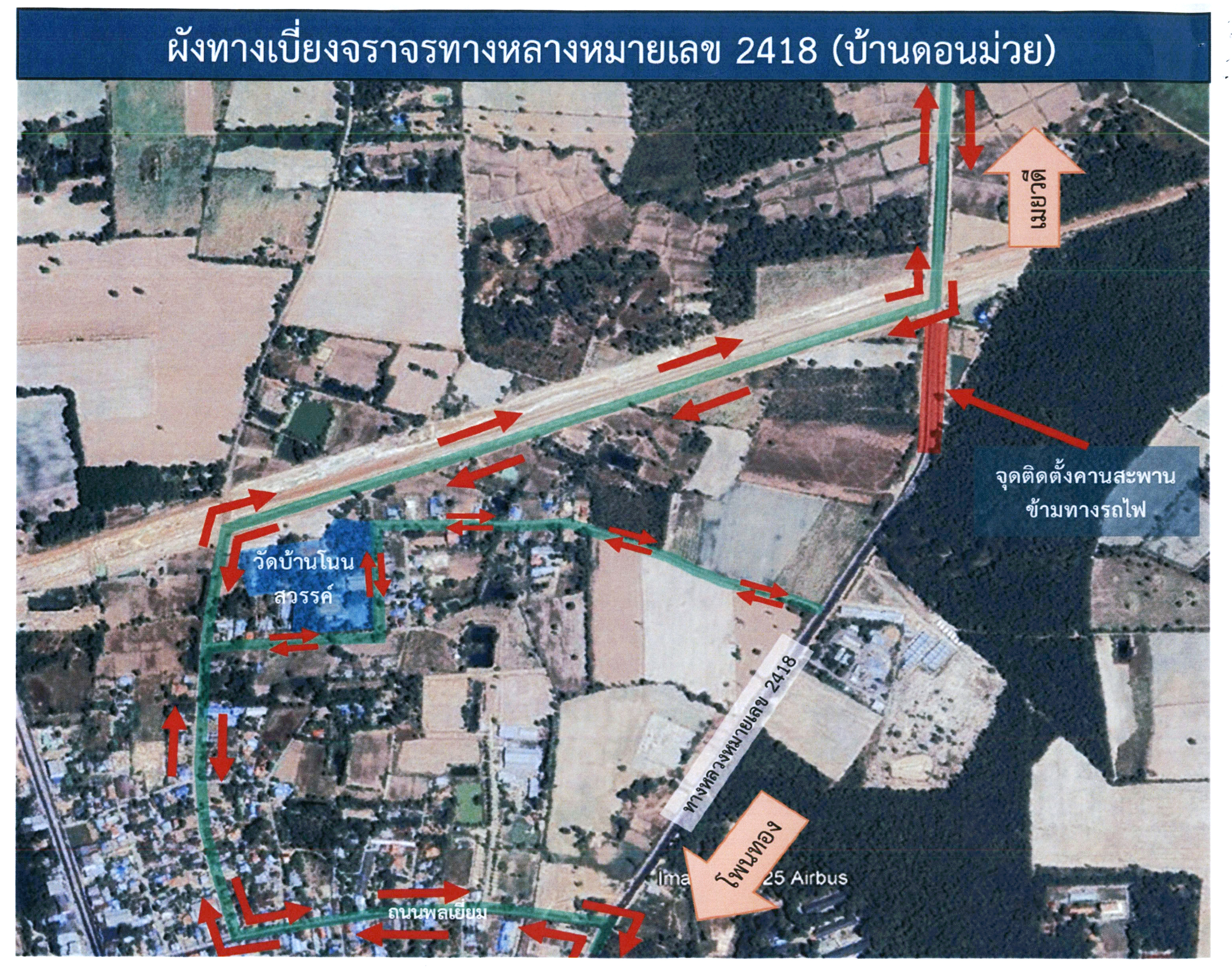 "แจ้งทางเบี่ยงช่องจราจร เพื่อวางคานสะพานรถยนต์ข้ามทางรถไฟ ทล.2418 สาย โพนทอง - หนองพอก (ช่วงบ้านดอนม่วย) ระหว่าง วันที่ 22 กรกรฏาคม 2568 - 23 กรกฏาคม 2568 เวลา 08.00 – 18.00 น. จำนวน 2 วัน"