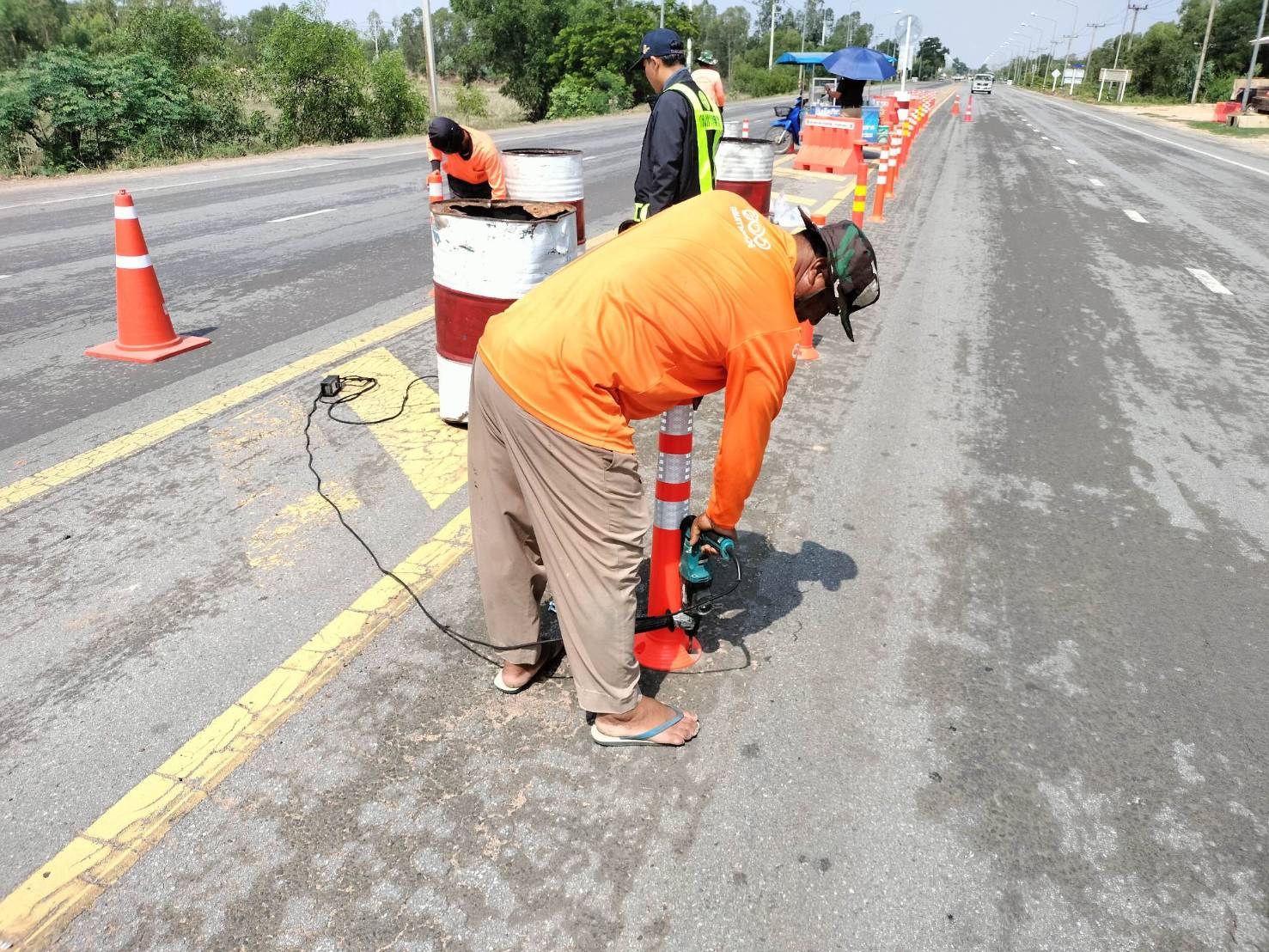 "คณะประเมินผลงานบำรุงทางฯ ร่วมลงพื้นที่สำรวจตรวจสอบ แนะนำงานปรับปรุงจุดเสี่ยง โดยได้ทำการติดตั้งอุปกรณ์ทำวงเวียนชั่วคราว (สามแยกบ้านเกล็ดลิ่นและสามแยกอำเภอจังหาร) ในทางหลวงหมายเลข 214 ตอน ลำชี – ร้อยเอ็ด ที่กม.40+700 และที่กม.37+625"