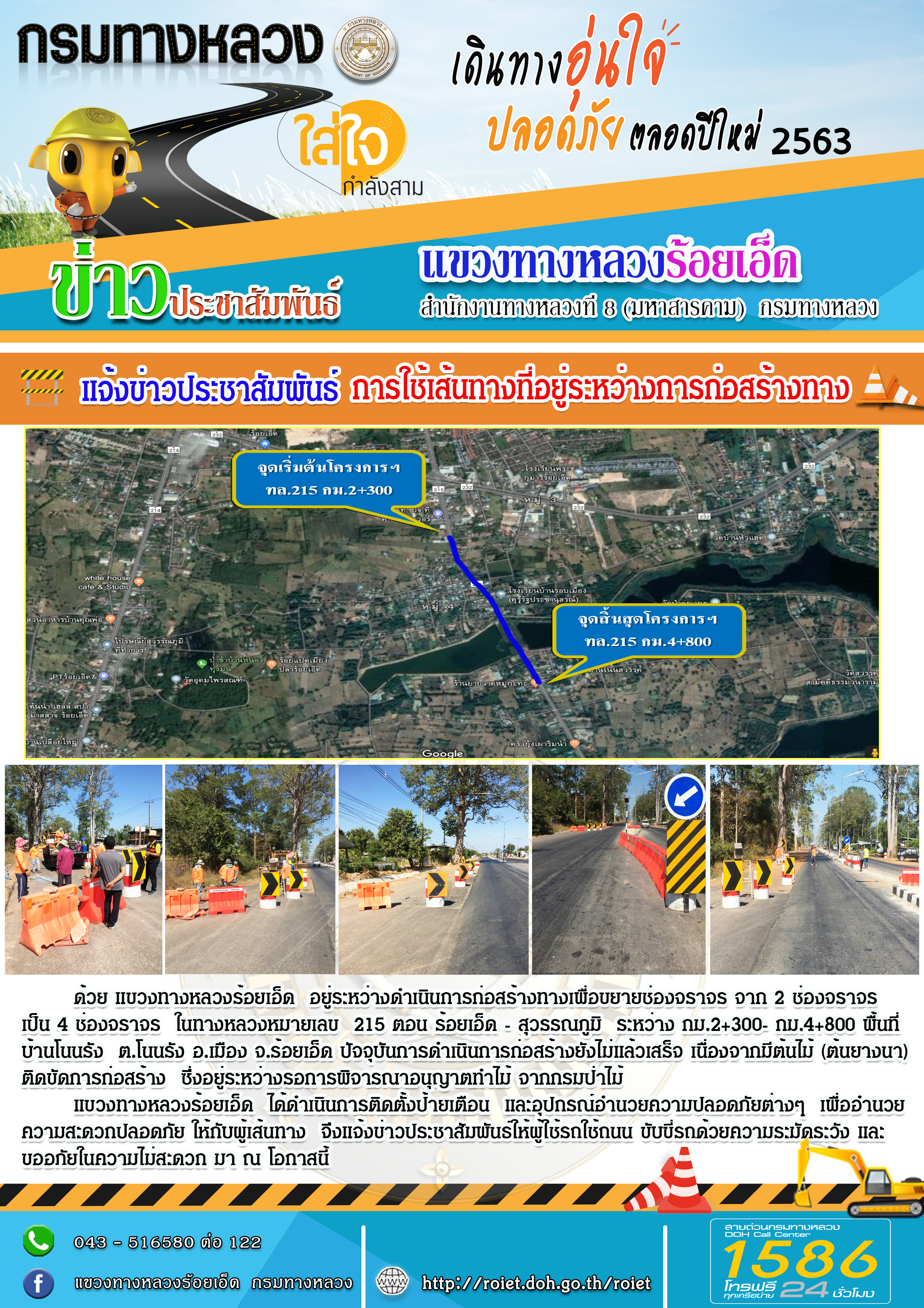 แจ้งข่าวประชาสัมพันธ์ การใช้เส้นทางที่อยู่ระหว่างการก่อสร้างทาง ทล.215