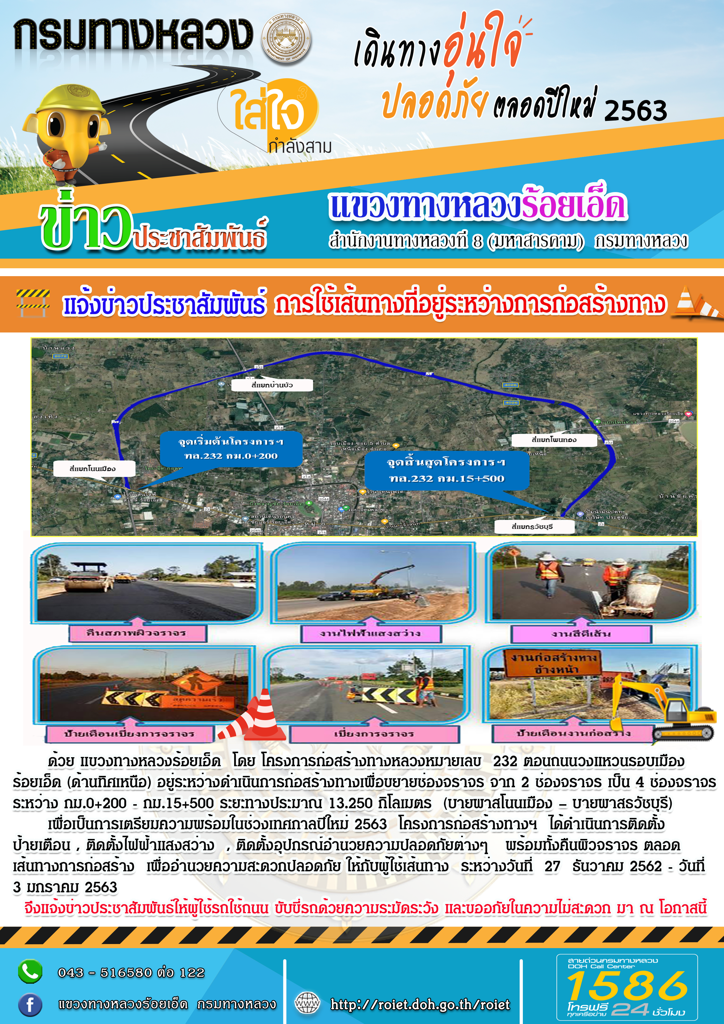 แจ้งข่าวประชาสัมพันธ์ การใช้เส้นทางที่อยู่ระหว่างการก่อสร้างทาง ทล.232 ช่วงเทศกาลปีใหม่ 2563