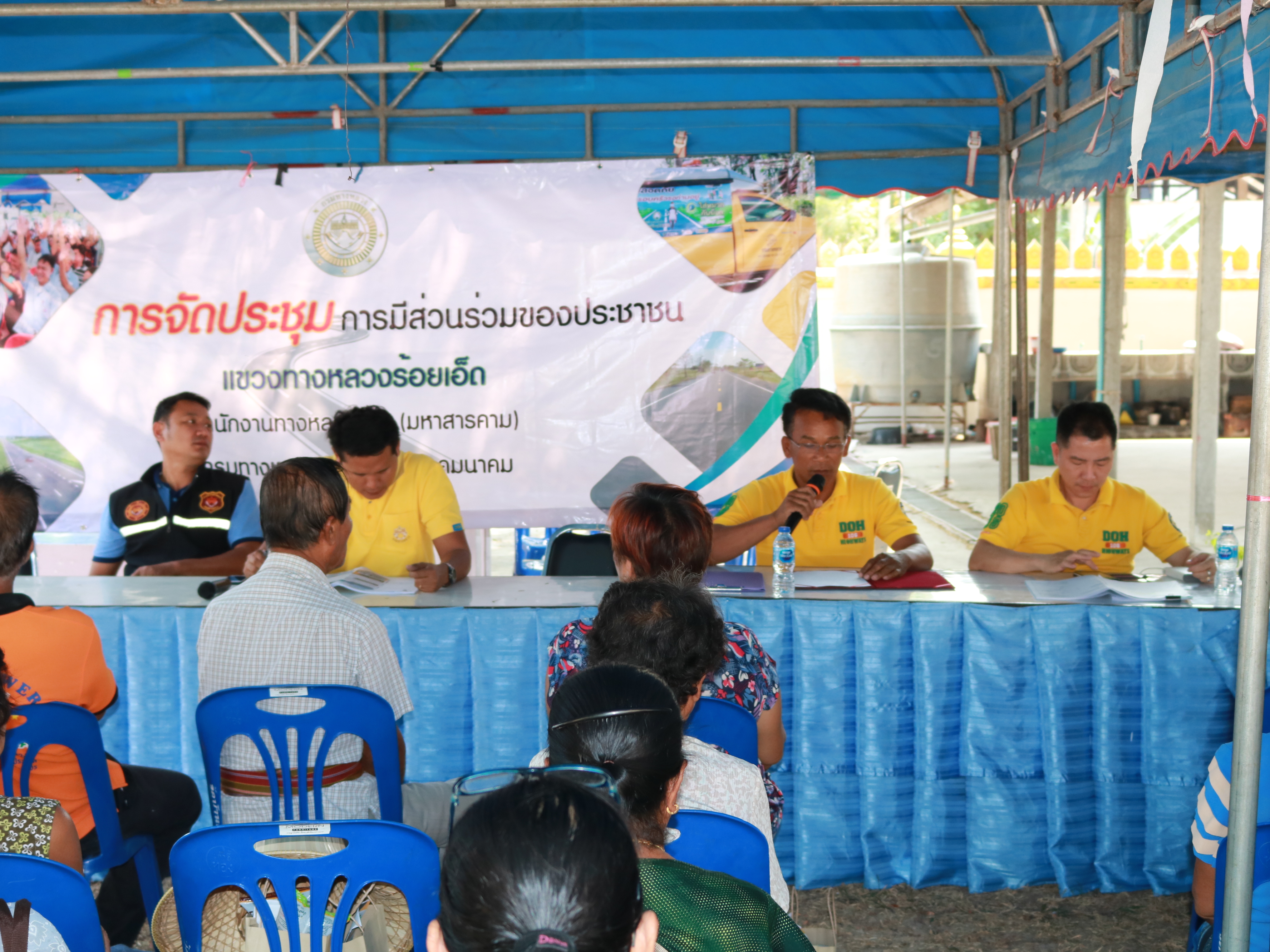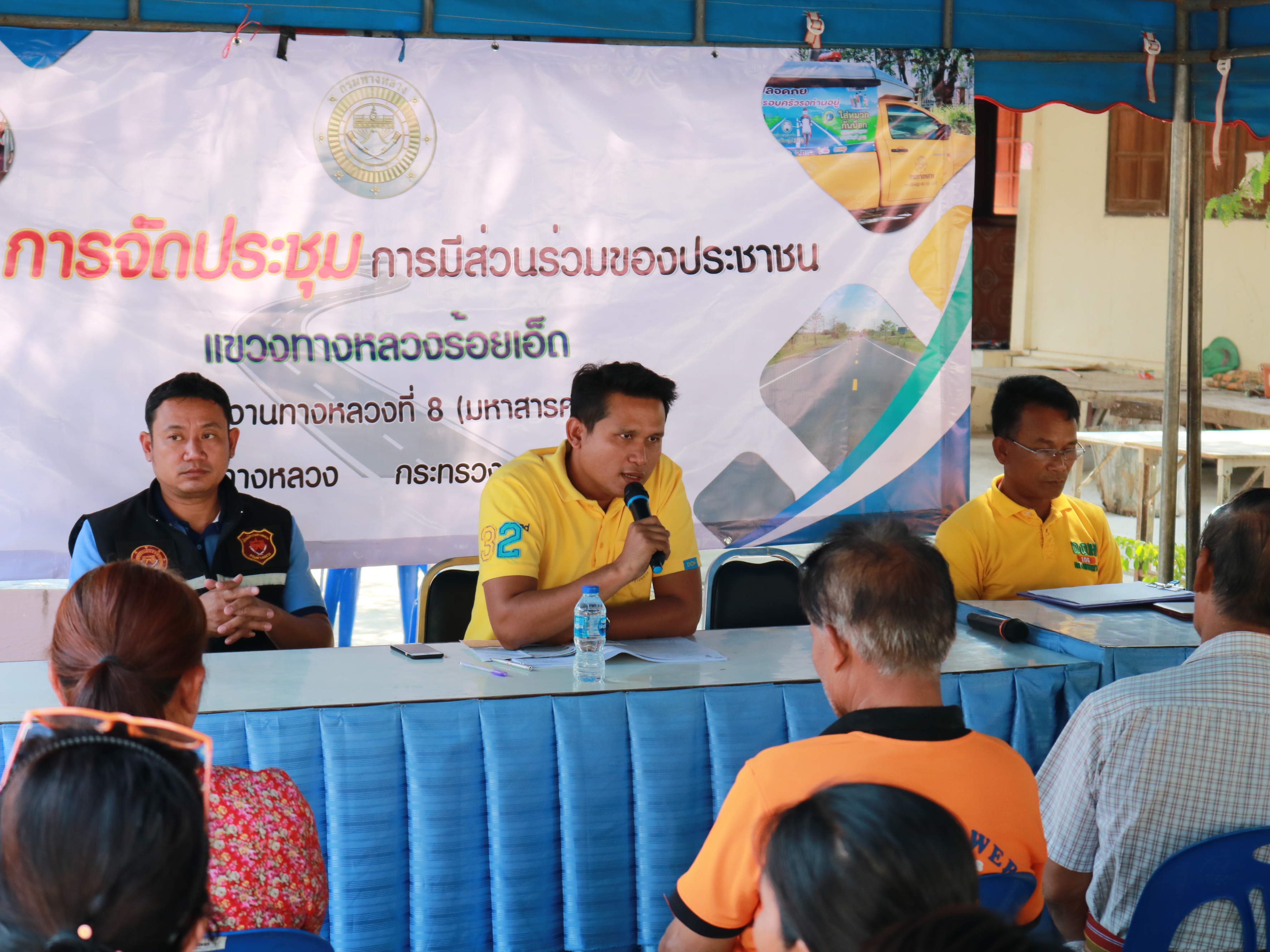 นายสถิต คำพิชิต รองผู้อำนวยการแขวงทางหลวงร้อยเอ็ด ฝ่ายปฏิบัติการ รับมอบหมายจากผู้อำนวยการแขวงทางหลวงร้อยเอ็ด ร่วมกับนายธนัชพงศ์ เลิศปิติพิทักษ์ วิศวกรโยธาชำนาญการ ส่วนสำรวจและออกแบบ สำนักงานทางหลวงที่ 8 (มหาสารคาม) และคณะเจ้าหน้าที่แขวงทางหลวงร้อยเอ็ด ร่วมประชุมการมีส่วนร่วมของประชาชน เพื่อรับฟังความคิดเห็น/ข้อเสนอแนะ ของทุกภาคส่วน ในการดำเนินงานตาม "โครงการเพิ่มประสิทธิภาพทางหลวง งานกลุ่มจังหวัด ประจำปีงบประมาณ พ.ศ. 2562" ในทางหลวงหมายเลข 2043 ตอน ร้อยเอ็ด - ยางเฌอ ระหว่าง กม.4+230 – กม.8+500 ระยะทาง 4.270 กิโลเมตร ณ บริเวณวัดบ้านเขวา ตำบลรอบเมือง อำเภอเมือง จังหวัดร้อยเอ็ด