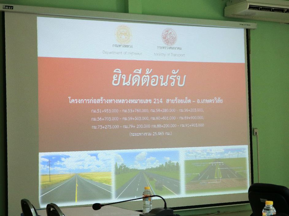 นายเกียรติพงษ์ เจียรนัยธนะกิจ ผู้อำนวยการแขวงทางหลวงร้อยเอ็ด พร้อมด้วยนายช่างโครงการก่อสร้างทางหลวงหมายเลข 214 สาย ร้อยเอ็ด - เกษตรวิสัย และคณะเจ้าหน้าที่แขวงทางหลวงร้อยเอ็ด ร่วมกับหน่วยงานต่างๆ เช่น การไฟฟ้าส่วนภูมิภาคจังหวัดร้อยเอ็ด , การประปาส่วนภูมิภาคจังหวัดร้อยเอ็ด , TOT , CAT และองค์กรปกครองส่วนท้องถิ่น ร่วมประชุมหารือ เพื่อแก้ไขปัญหาสาธารณูปโภคติดขัดการก่อสร้าง ในทางหลวงหมายเลข 214 สาย ร้อยเอ็ด - เกษตรวิสัย ซึ่งอยู่ระหว่างดำเนินการก่อสร้าง เพื่อขยายช่องจราจรจาก 2 ช่องจราจร เป็น 4 ช่องจราจร ระยะทางประมาณ 25.457 กิโลเมตร ณ ห้องประชุมจุลละโพธิ แขวงทางหลวงร้อยเอ็ด