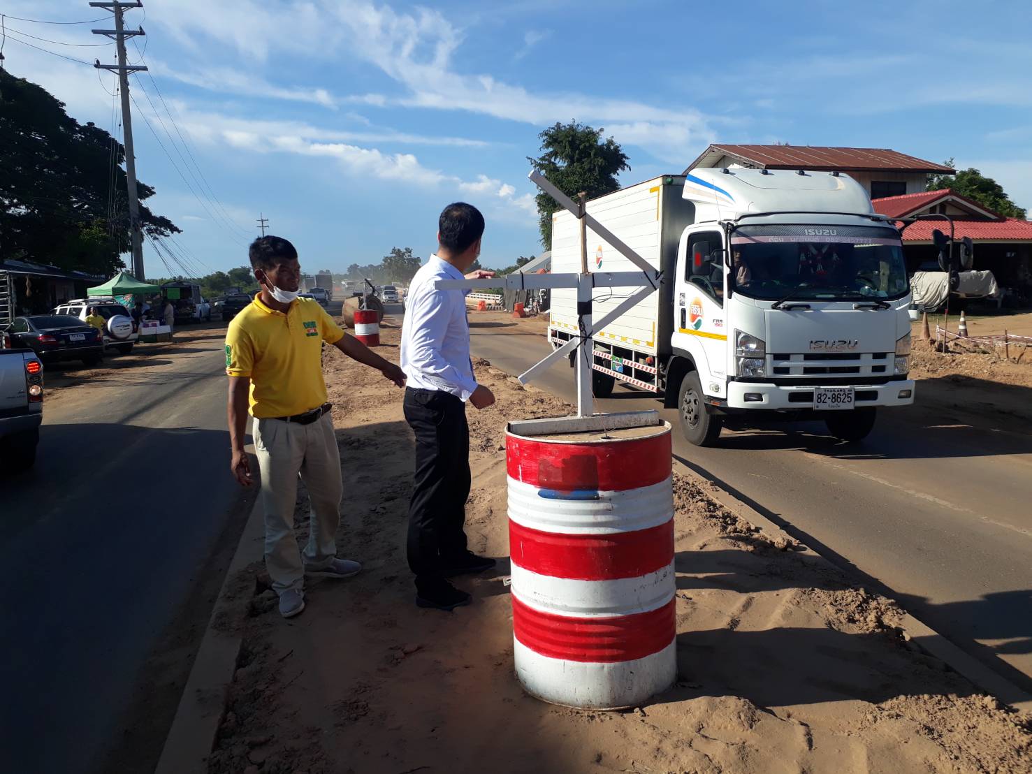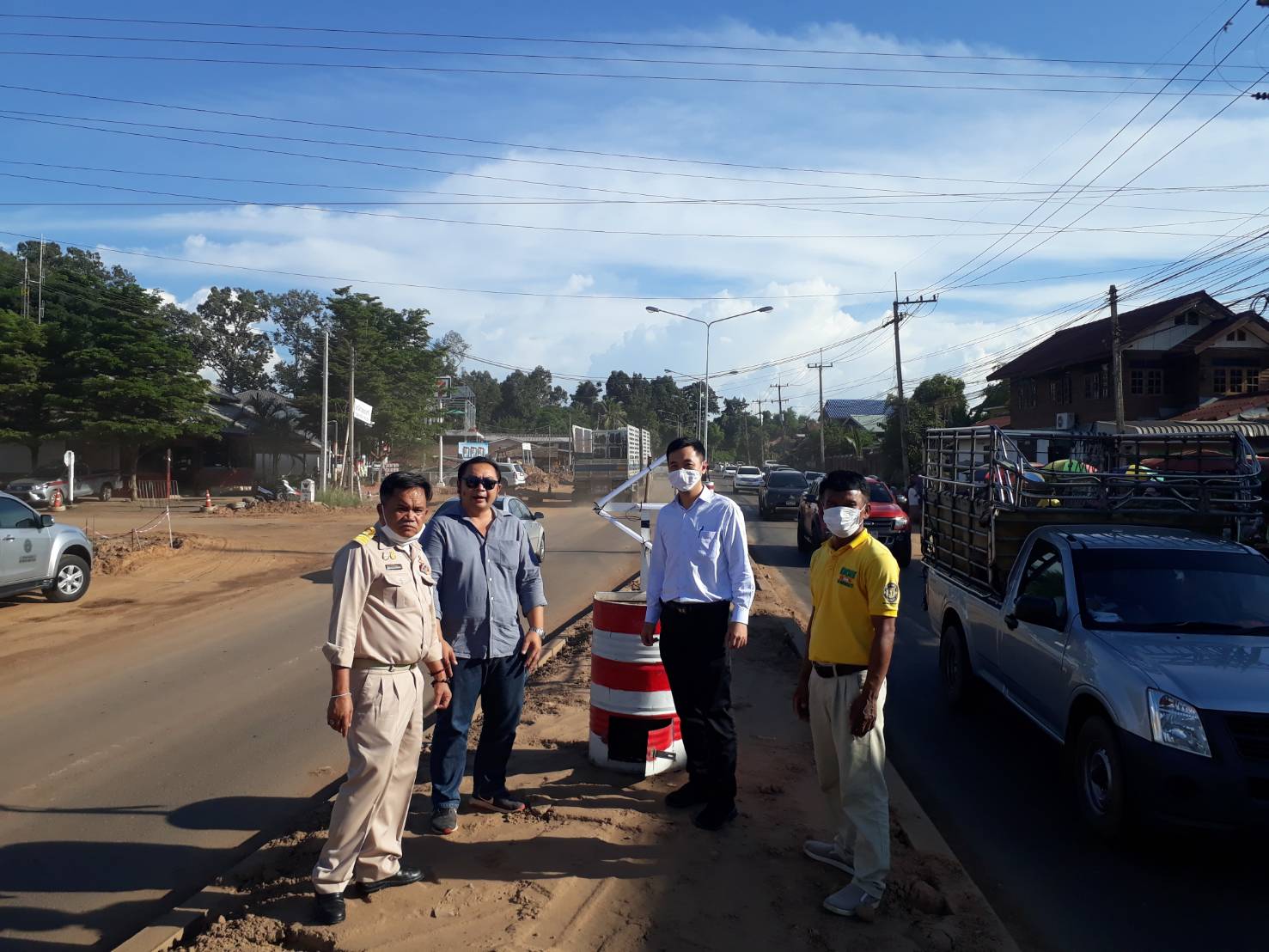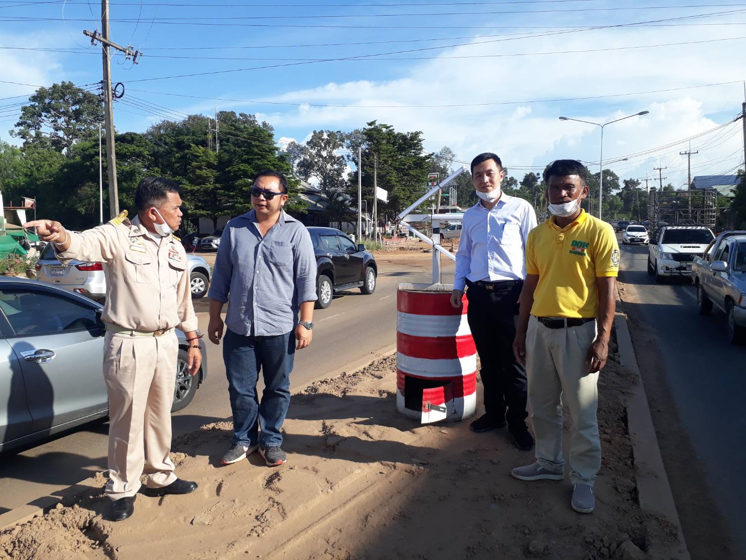 นายเกียรติพงษ์ เจียรนัยธนะกิจ ผู้อำนวยการแขวงทางหลวงร้อยเอ็ด พร้อมด้วยนายสมัย คะนะมะ รองผู้อำนวยการแขวงทางหลวงร้อยเอ็ด ฝ่ายวิศวกรรม ,นายสถิต คำพิชิต รองผู้อำนวยการแขวงทางหลวงร้อยเอ็ด ฝ่ายปฏิบัติการ ร่วมตรวจงานก่อสร้าง งานจ้างเหมาโครงการพัฒนาโครงข่ายคมนาคมขนส่ง กิจกรรมพัฒนาระบบขนส่งทางบก งานขยายถนนจาก 2 ช่องจราจรเป็น 4 ช่องจราจร ตำบลธงธานี อำเภอธวัชบุรี จังหวัดร้อยเอ็ด ในทางหลวงหมายเลข 2044 ตอน ร้อยเอ็ด - หนองดง ระหว่าง กม.20+000 - กม.22+500 โดยมี ห้างหุ้นส่วนจำกัด ที เอ พี 101 เป็นผู้รับจ้าง