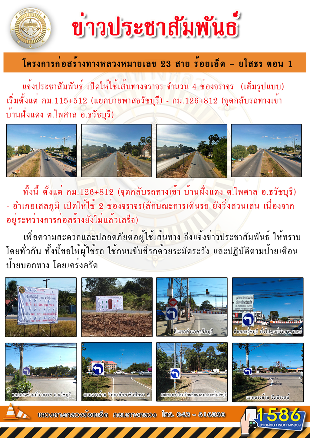 แจ้งประชาสัมพันธ์ เปิดให้ใช้เส้นทางจราจร จำนวน 4 ช่องจราจร (เต็มรูปแบบ) เริ่มตั้งแต่ กม.115+512 (แยกบายพาสธวัชบุรี) - กม.126+812 (จุดกลับรถทางเข้า บ้านฝั่งแดง ต.ไพศาล อ.ธวัชบุรี)