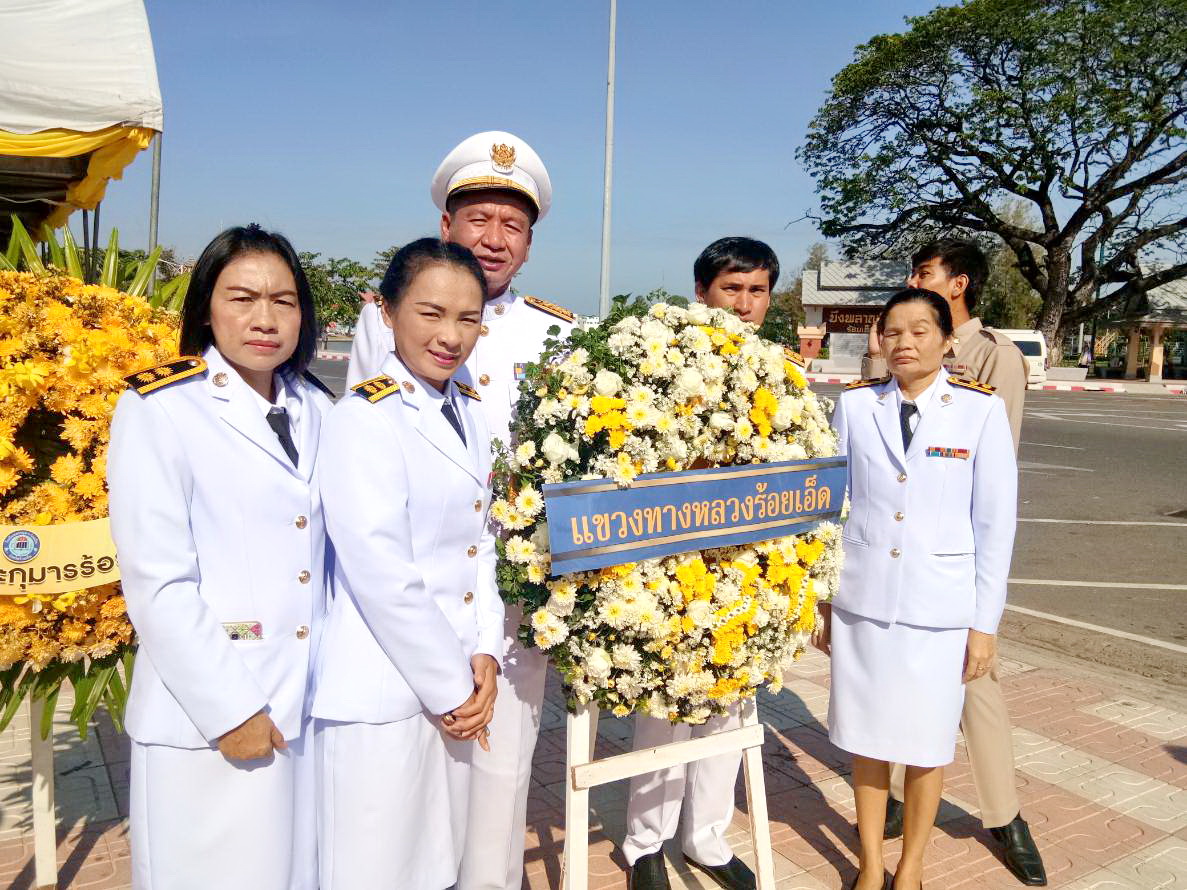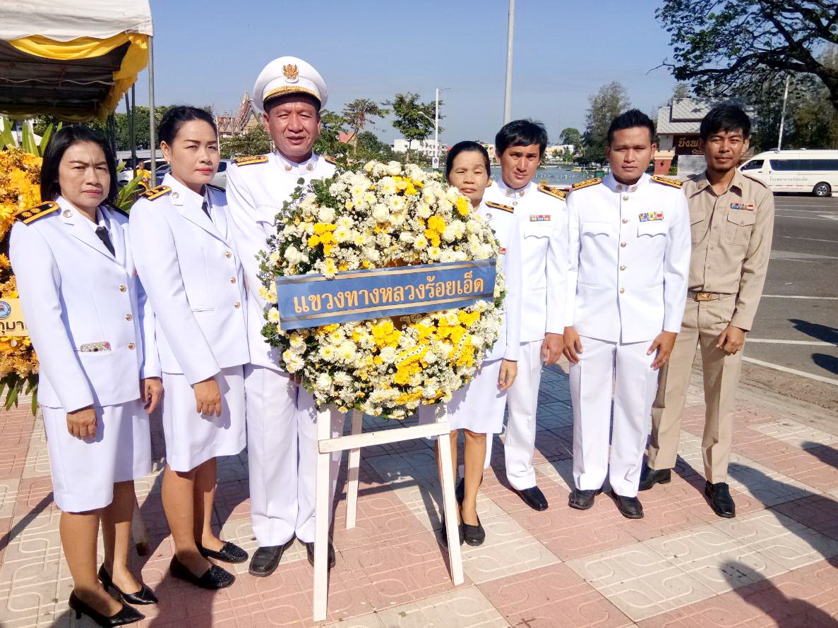 คณะเจ้าหน้าที่แขวงทางหลวงร้อยเอ็ด ร่วมกิจกรรมวางพวงมาลาและถวายบังคม ในพิธีบำแพ็ญพระราชกุศลเนื่องในโอกาสวันคล้ายวันสวรรคต พระบาทสมเด็จพระปรมินทรมหาภูมิพลอดุลยเดช ณ ลานสาเกตนคร สวนสมเด็จพระศรีนครินทร์ร้อยเอ็ด อำเภอเมือง จังหวัดร้อยเอ็ด