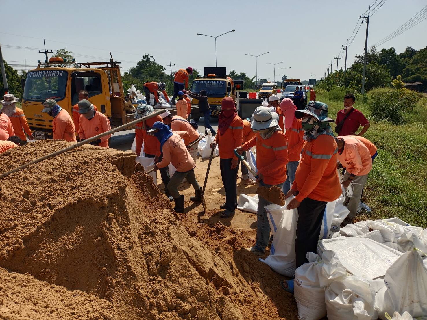 "บรรจุทรายลงกระสอบเพื่อทำแนวป้องกันน้ำท่วมผิวทาง ทล. 214 กม.29+600 - กม.29+900 ด้านขวาทาง"