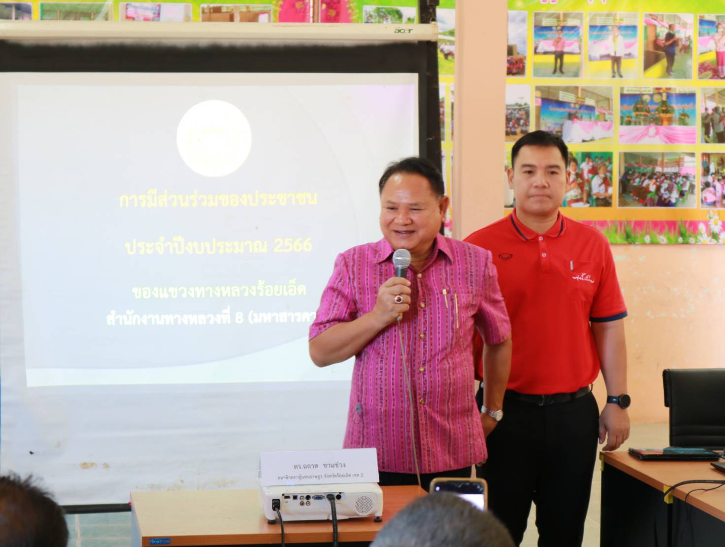 นายมงคล แสนวงษา ผู้อำนวยการแขวงทางหลวงร้อยเอ็ด พร้อมด้วยนายสมัย คะนะมะ รองผู้อำนวยการแขวงทางหลวงร้อยเอ็ด ฝ่ายวิศวกรรม ,นายสถิต คำพิชิต รองผู้อำนวยการแขวงทางหลวงร้อยเอ็ด ฝ่ายปฏิบัติการ และเจ้าหน้าที่จากส่วนสำรวจและออกแบบ สำนักงานทางหลวงที่ 8 (มหาสารคาม) ร่วมประชุมการมีส่วนร่วมของประชาชน เพื่อรับฟังความคิดเห็นของทุกภาคส่วน ในการดำเนินงานก่อสร้าง ในทางหลวงหมายเลข 2116 ตอน ร่องคำ - โพนทอง ระหว่าง กม.54+150 - กม.56+000 และในทางหลวงหมายเลข 2327 ตอน บัวคำ - โพธิ์ชัย ระหว่าง กม.0+212 - กม.2+550 โดยมี ดร.ฉลาด ขามช่วง สมาชิกสภาผู้แทนราษฎร จังหวัดร้อยเอ็ด เขต 2 เป็นประธานในการประชุม ณ ห้องประชุมเทศบาลตำบลบัวคำ ตำบลบัวคำ อำเภอโพธิ์ชัย จังหวัดร้อยเอ็ด