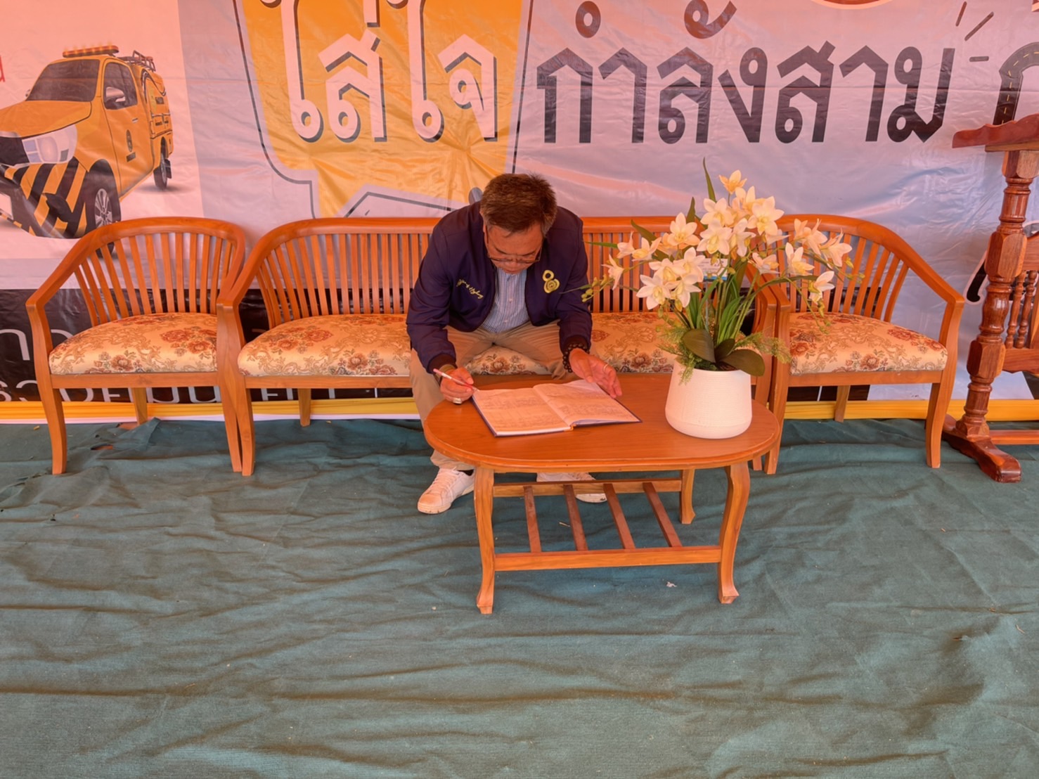 นายสมัย คะนะมะ รองผู้อำนวยการแขวงทางหลวงร้อยเอ็ด ฝ่ายวิศวกรรม ตรวจเยี่ยมเพื่อให้กำลังใจแก่เจ้าหน้าที่ผู้ปฏิบัติงาน ศูนย์อำนวยความสะดวกและปลอดภัยในช่วงเทศกาลปีใหม่ 2566 ณ “จุดบริการทั่วไทย” บริเวณจุดพักรถ ในทางหลวงหมายเลข 23 ตอน ห้วยแอ่ง - ร้อยเอ็ด ที่ กม.103+750 ด้านซ้ายทาง (จุดพักรถบ้านดงยาง)