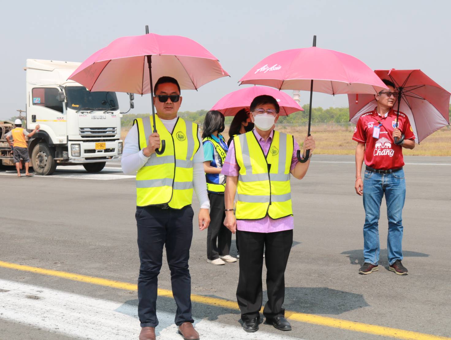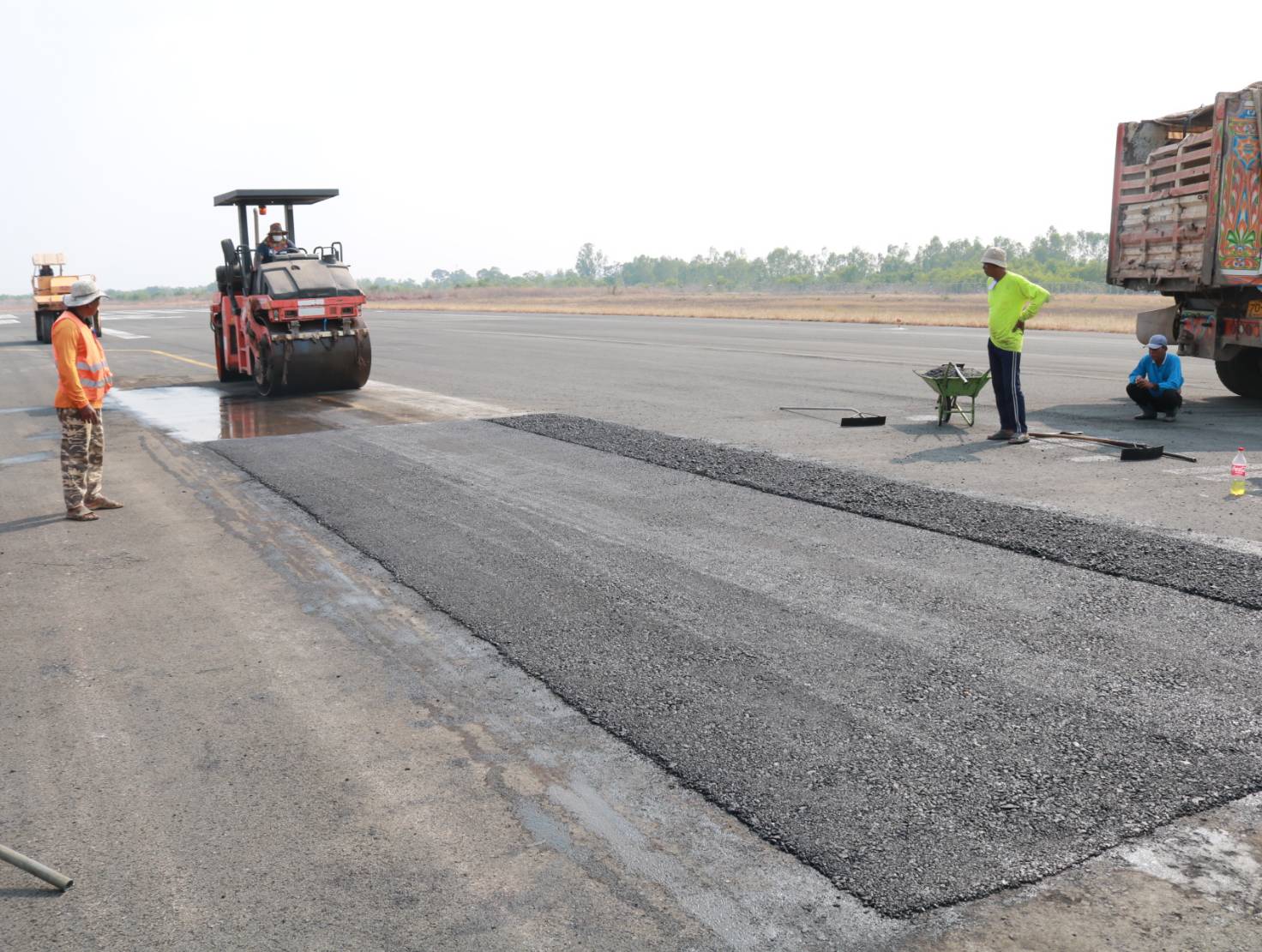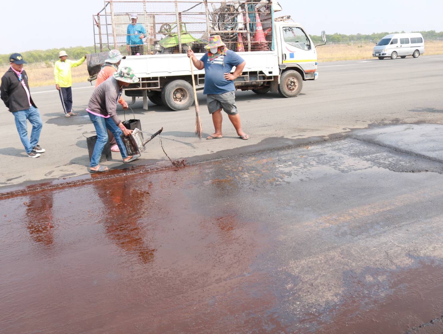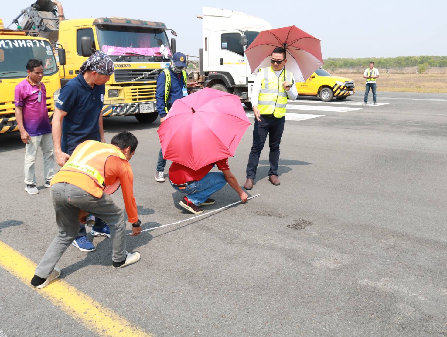 "ร่วมลงพื้นที่อำนวยการตรวจสอบแนะนำวิธีการปฏิบัติงานการขูดไส และซ่อมผิวแอสฟัลต์ ของทางวิ่ง (Runway) บริเวณทางขึ้น - ทางลงที่เกิดหลุดร่อนเสียหายอันจะก่อให้เกิดอันตรายแก่ผู้ใช้บริการ"