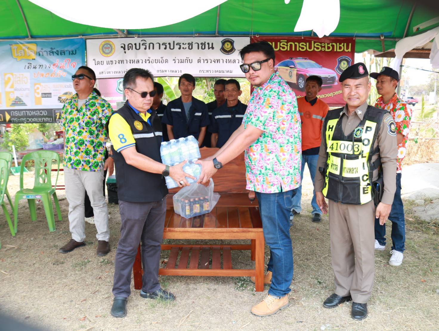 นายมงคล แสนวงษา ผู้อำนวยการแขวงทางหลวงร้อยเอ็ด พร้อมด้วยนายสมัย คะนะมะ รองผู้อำนวยการแขวงทางหลวงร้อยเอ็ด ฝ่ายวิศวกรรม ,นายพิทักษ์ ทาตะนาม หัวหน้าหมวดทางหลวงเกษตรวิสัย และนายศุภพรชัย ขามรัตน์ หัวหน้าหมวดทางหลวงเมืองสรวง ร่วมตรวจเยี่ยมจุดบริการประชาชนช่วงเทศกาลสงกรานต์ 2566 ในทางหลวงหมายเลข 202 ตอน เกษตรวิสัย - สุวรรณภูมิ ที่ กม.194+200 พร้อมมอบสิ่งของเพื่อเป็นขวัญและกำลังใจแก่เจ้าหน้าที่ผู้ปฏิบัติงานในช่วงเทศกาลสงกรานต์ 2566 (ระหว่างวันที่ 11 – 17 เมษายน 2566)