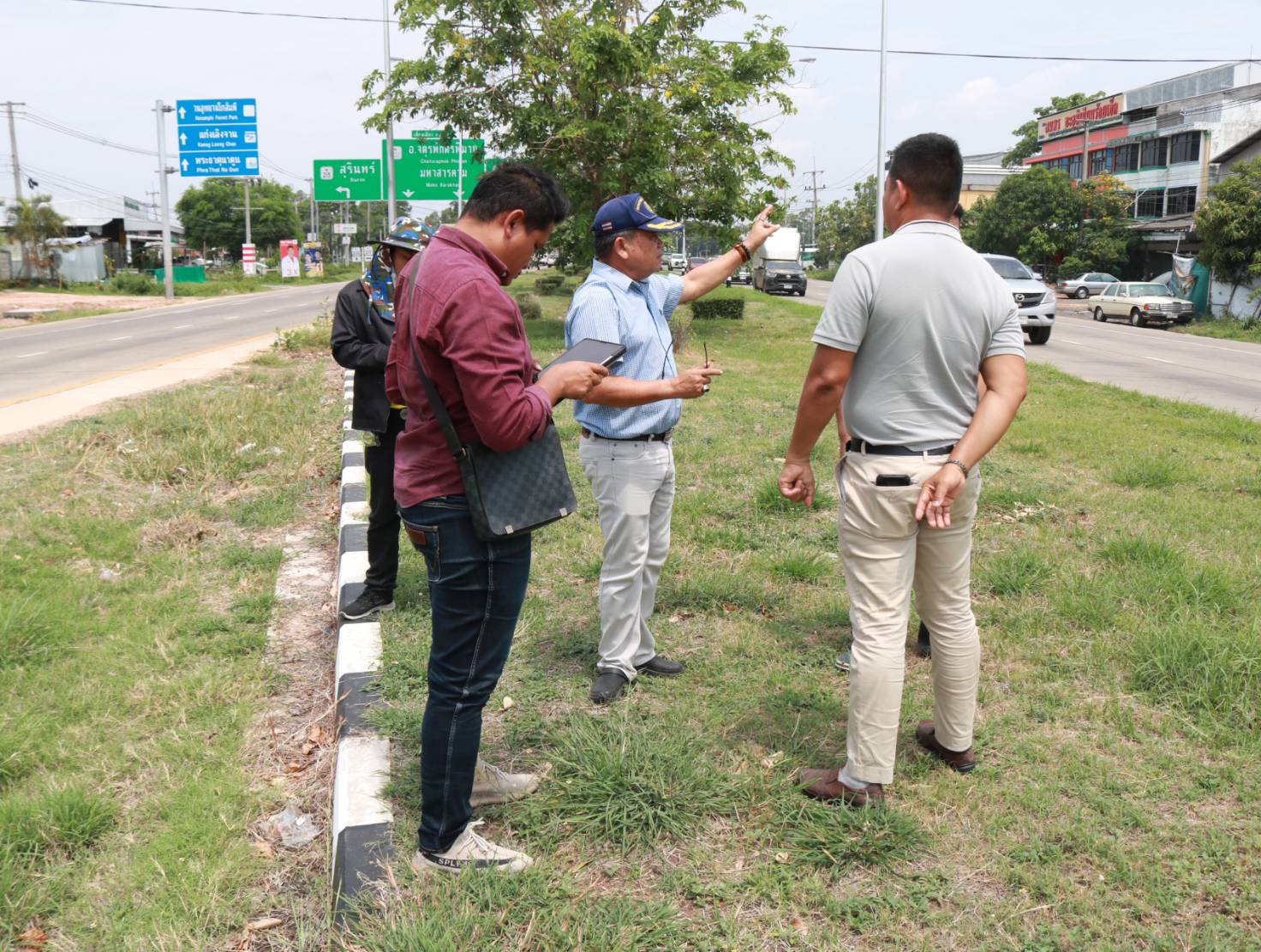 นายมงคล แสนวงษา ผู้อำนวยการแขวงทางหลวงร้อยเอ็ด พร้อมด้วยนายสมัย คะนะมะ รองผู้อำนวยการแขวงทางหลวงร้อยเอ็ด ฝ่ายวิศวกรรม ,นายณัฐพล เยี่ยมชัยภูมิ หัวหน้าหมวดทางหลวงร้อยเอ็ด และนายสุนทร ประเสริฐสวัสดิ์ หัวหน้างานวางแผน ร่วมลงพื้นที่ตรวจสอบความเหมาะสมของโครงการ กิจกรรมก่อสร้างทางหลวงพัฒนาพื้นที่ระดับภาค ในทางหลวงหมายเลข 232 ตอน ถนนวงแหวนรอบเมืองร้อยเอ็ด ที่กม.20+829 (แยกบายพาสสุวรรณภูมิ) เพื่อแก้ไขปัญหาการระบายน้ำจากตัวเมืองร้อยเอ็ด
