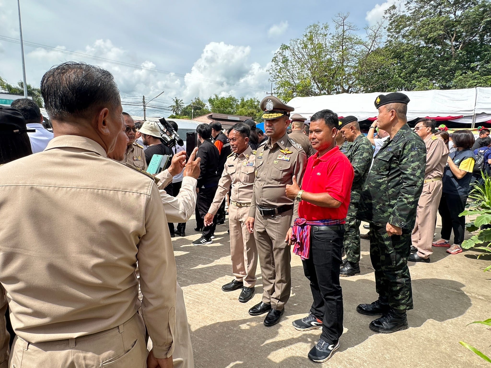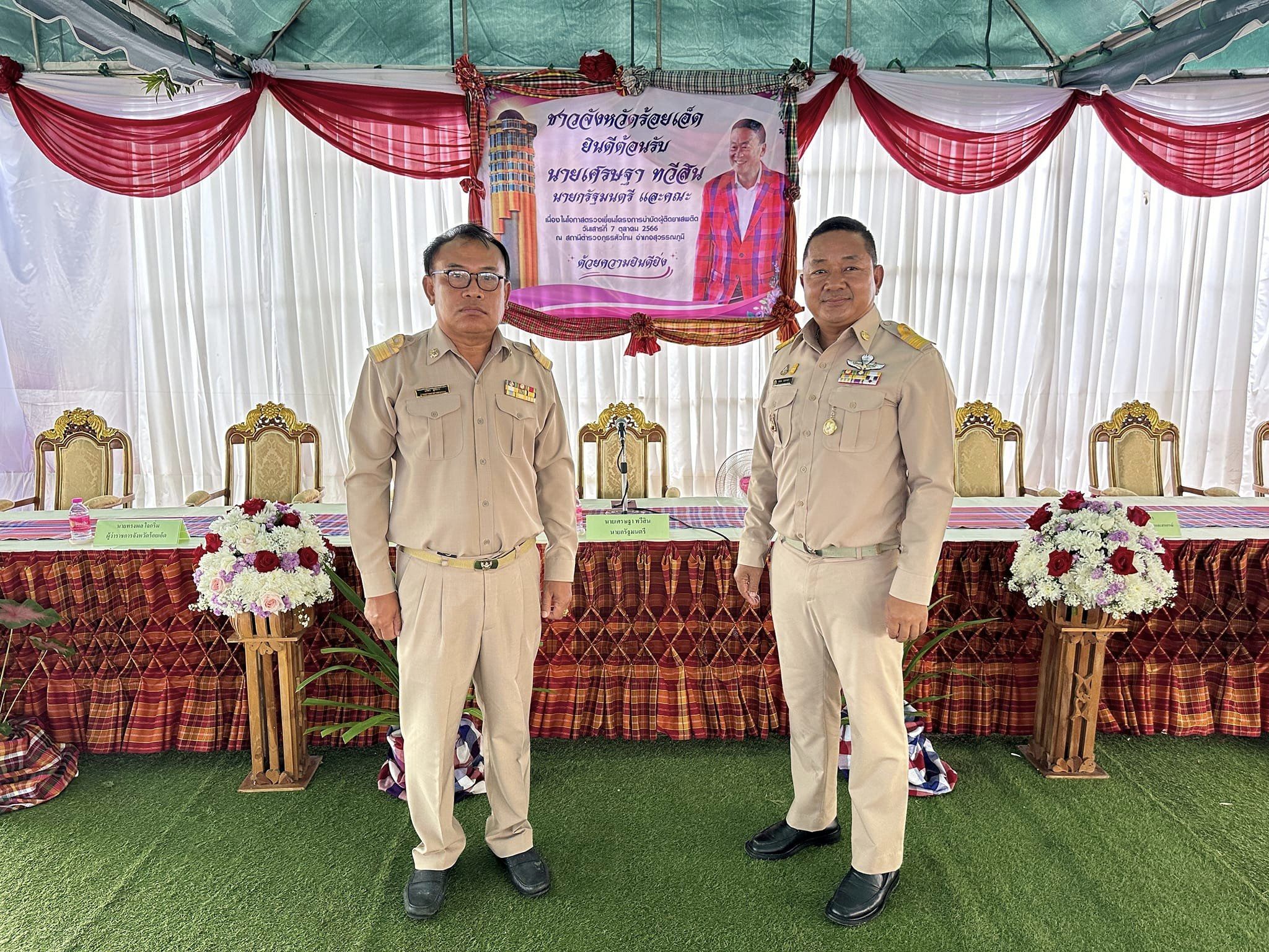นายมงคล แสนวงษา ผู้อำนวยการแขวงทางหลวงร้อยเอ็ด พร้อมด้วยเจ้าหน้าที่ส่วนราชการจังหวัดร้อยเอ็ด ร่วมให้การต้อนรับ นายกรัฐมนตรี นายเศรษฐา ทวีสิน ลงพื้นที่จังหวัดร้อยเอ็ด เพื่อตรวจเยี่ยมโครงการบำบัดผู้ติดยาเสพติด ณ สถานีตำรวจภูธรหัวโทน อำเภอสุวรรณภูมิ จังหวัดร้อยเอ็ด