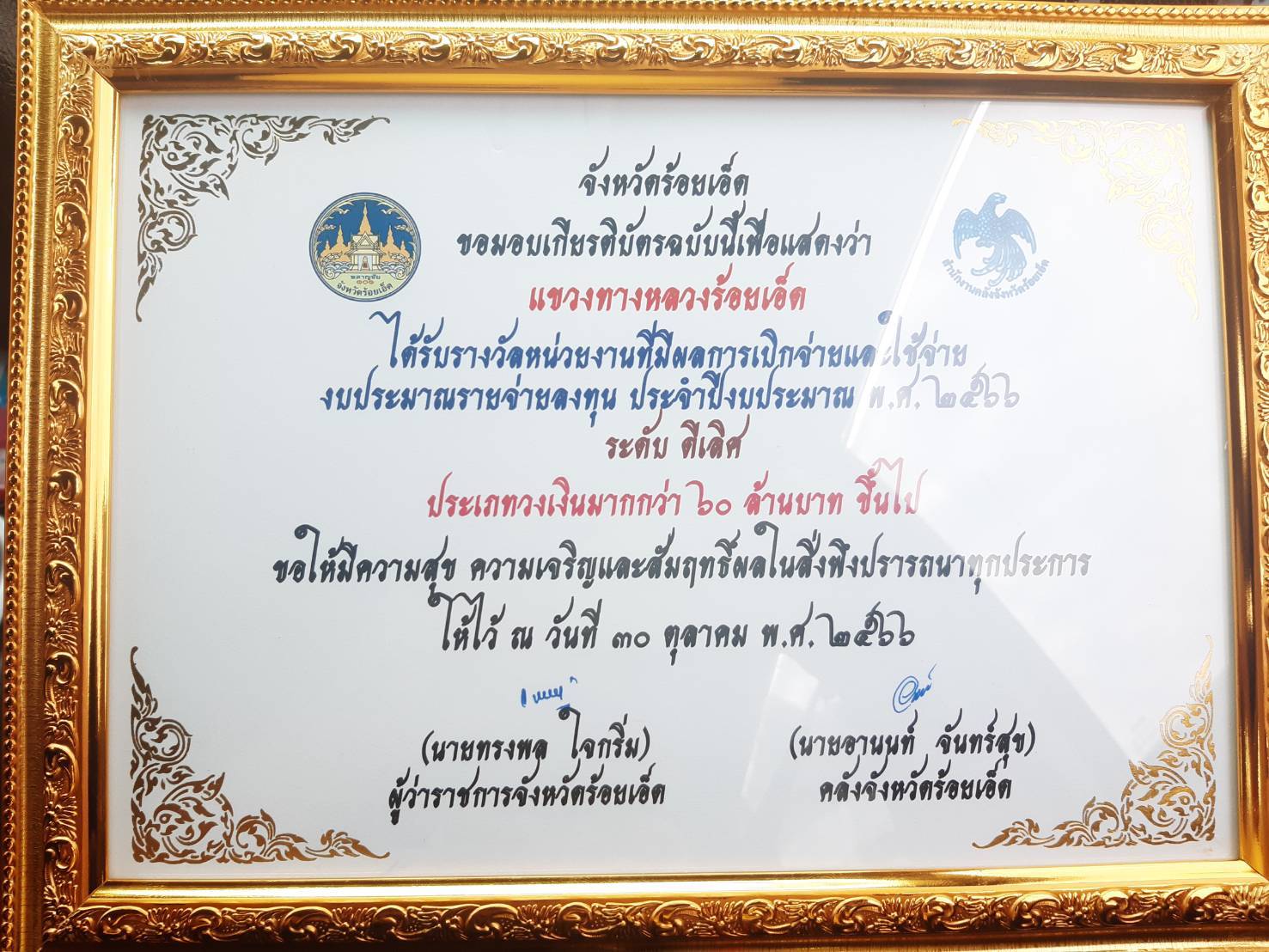 นายมงคล แสนวงษา ผู้อำนวยการแขวงทางหลวงร้อยเอ็ด มอบหมายให้นายสถิต คำพิชิต รองผู้อำนวยการแขวงทางหลวงร้อยเอ็ด ฝ่ายปฏิบัติการ เข้าร่วมประชุมคณะกรรมการจังหวัด หัวหน้าส่วนราชการ หัวหน้าหน่วยงาน และนายอำเภอ ประจำเดือนตุลาคม 2566 (ครั้งที่ 10/2566) และแขวงทางหลวงร้อยเอ็ดได้รับรางวัลหน่วยงานที่มีผลการเบิกจ่ายและใช้จ่ายงบประมาณรายจ่ายลงทุนระดับดีเลิศ ประจำปีงบประมาณ 2566 โดยมีนายทรงพล ใจกริ่ม ผู้ว่าราชการจังหวัดร้อยเอ็ด เป็นประธานในการประชุม ณ ห้องประชุมพระมหาเจดีย์ชัยมงคล ชั้น 5 ศาลากลางจังหวัดร้อยเอ็ด