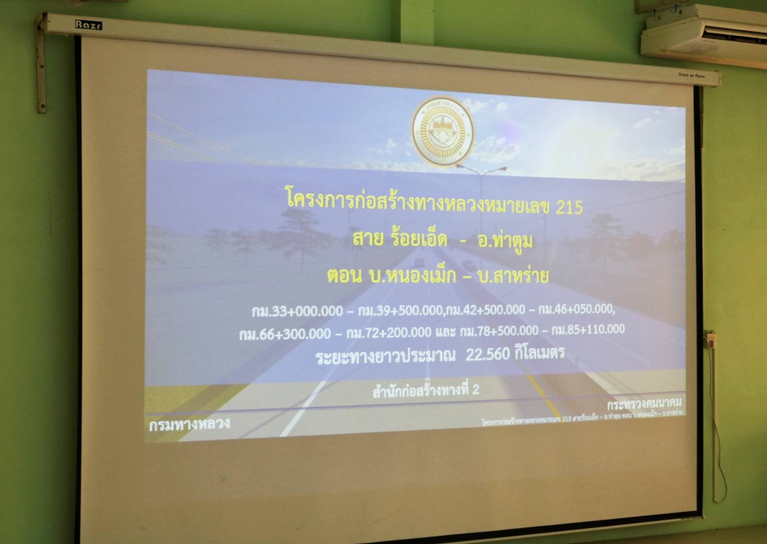 "ร่วมประชุมหารือที่ดินเอกชนทับซ้อนกับแนวเขตทางหลวง เพื่อแก้ไขปัญหา อุปสรรค ในระหว่างการก่อสร้าง ทล.215 สาย ร้อยเอ็ด - อ.ท่าตูม ตอน บ.หนองเม็ก - บ.สายหร่าย ระหว่าง กม.42+500 - กม.46+050"