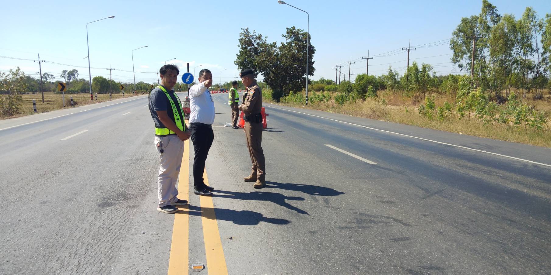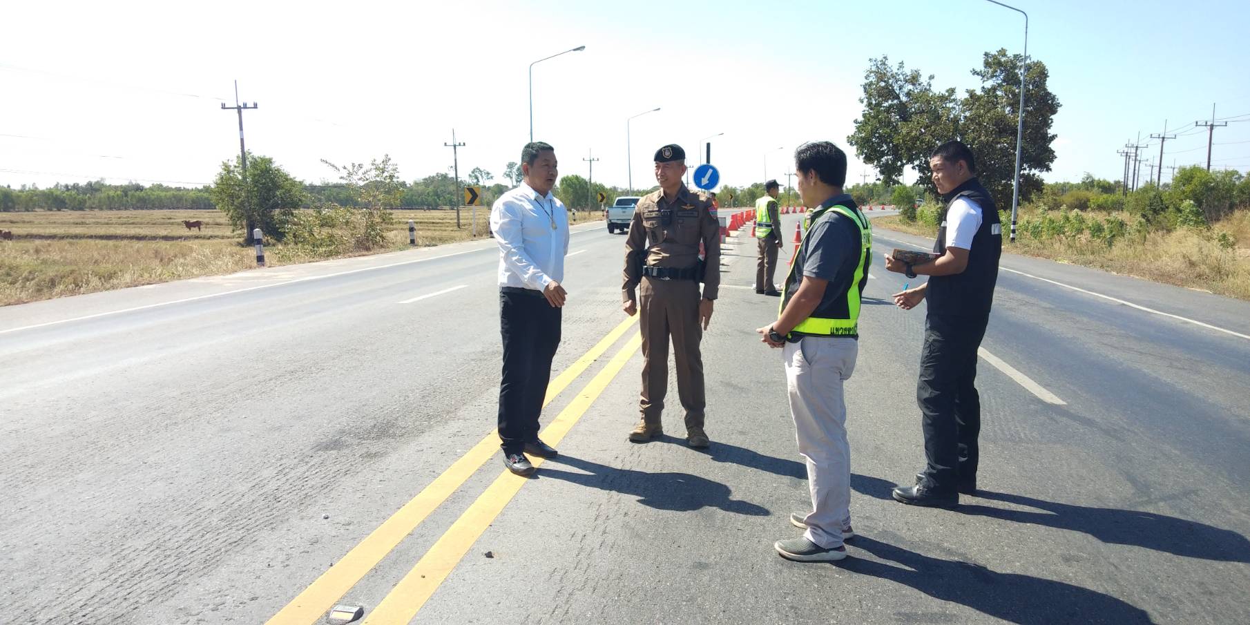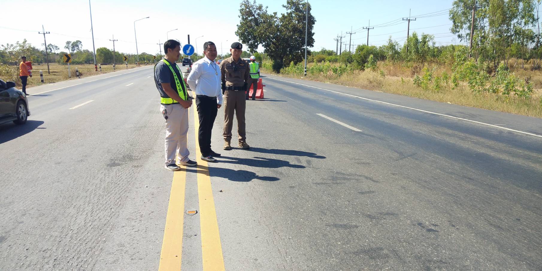 “ร่วมลงพื้นที่ตรวจสอบจุดเสี่ยงเนื่องจากเป็นทางโค้งที่เกิดอุบัติเหตุบ่อยครั้ง บริเวณโค้งบ้านสองชั้น ตำบลหินกองอำเภอสุวรรณภูมิ จังหวัดร้อยเอ็ด ทล.202 ตอน เกษตรวิสัย - สุวรรณภูมิ ระหว่าง กม.202+700 - กม.203+100 (ทางโค้งบ้านสองชั้น)”