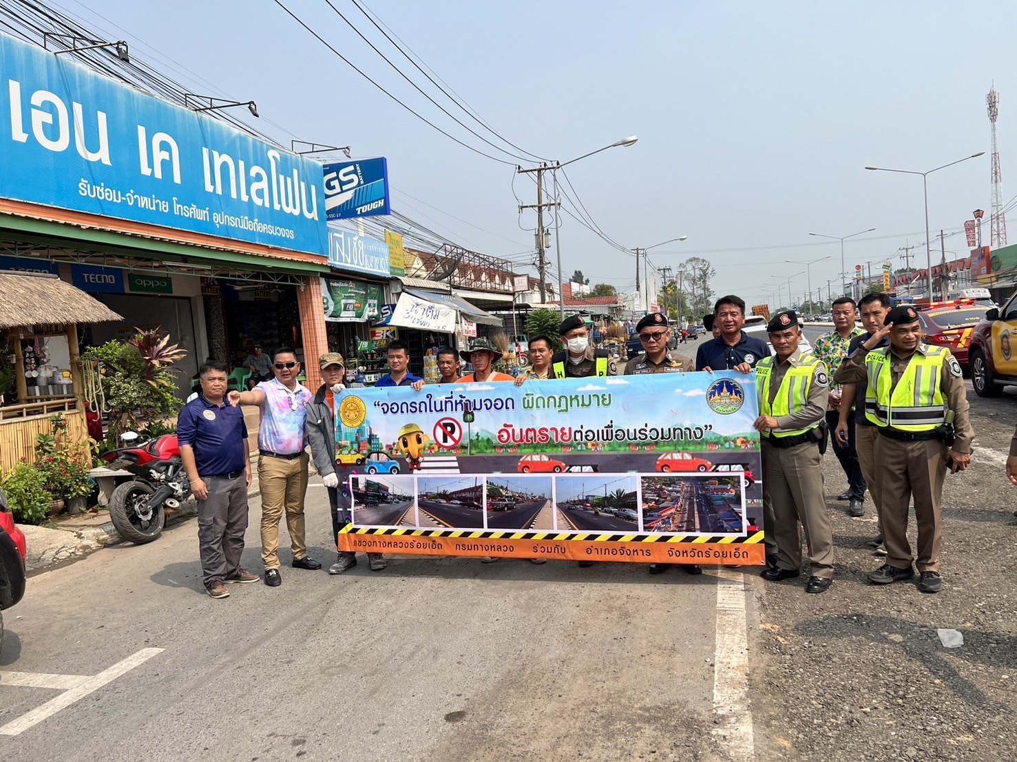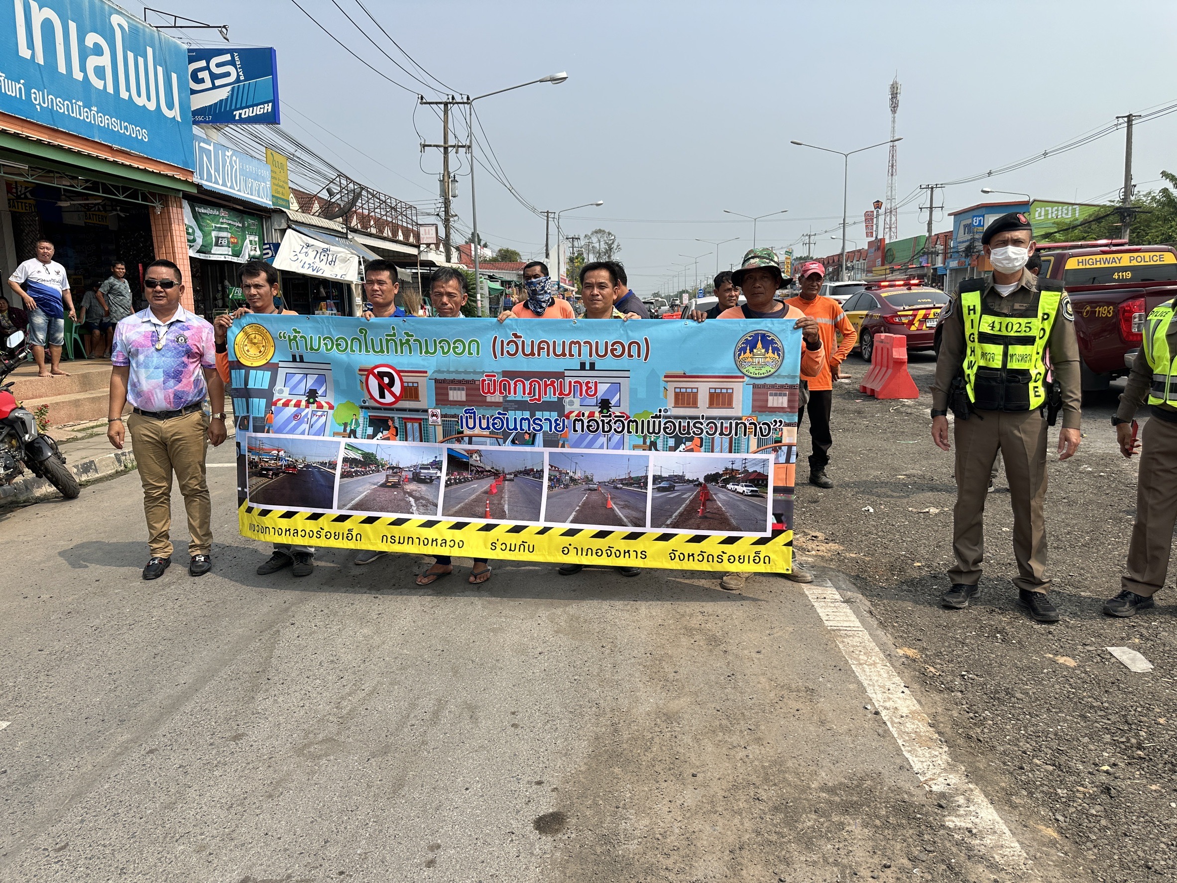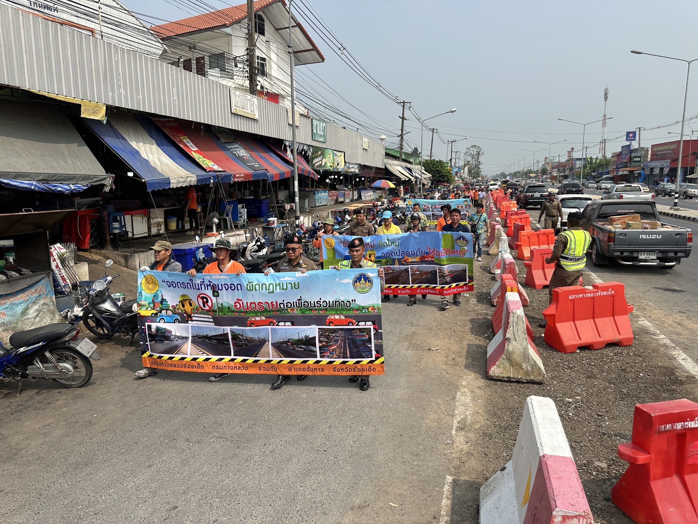 "ร่วมรณรงค์การปฏิบัติตามกฎหมาย ห้ามจอดในที่ห้ามจอด การจัดระเบียบการจราจร หน้าตลาดจังหาร ในทางหลวงหมายเลข 214 ตอน ลำชี – ร้อยเอ็ด ระหว่าง กม.37+500 - กม.38+300 ด้านขวาทาง"