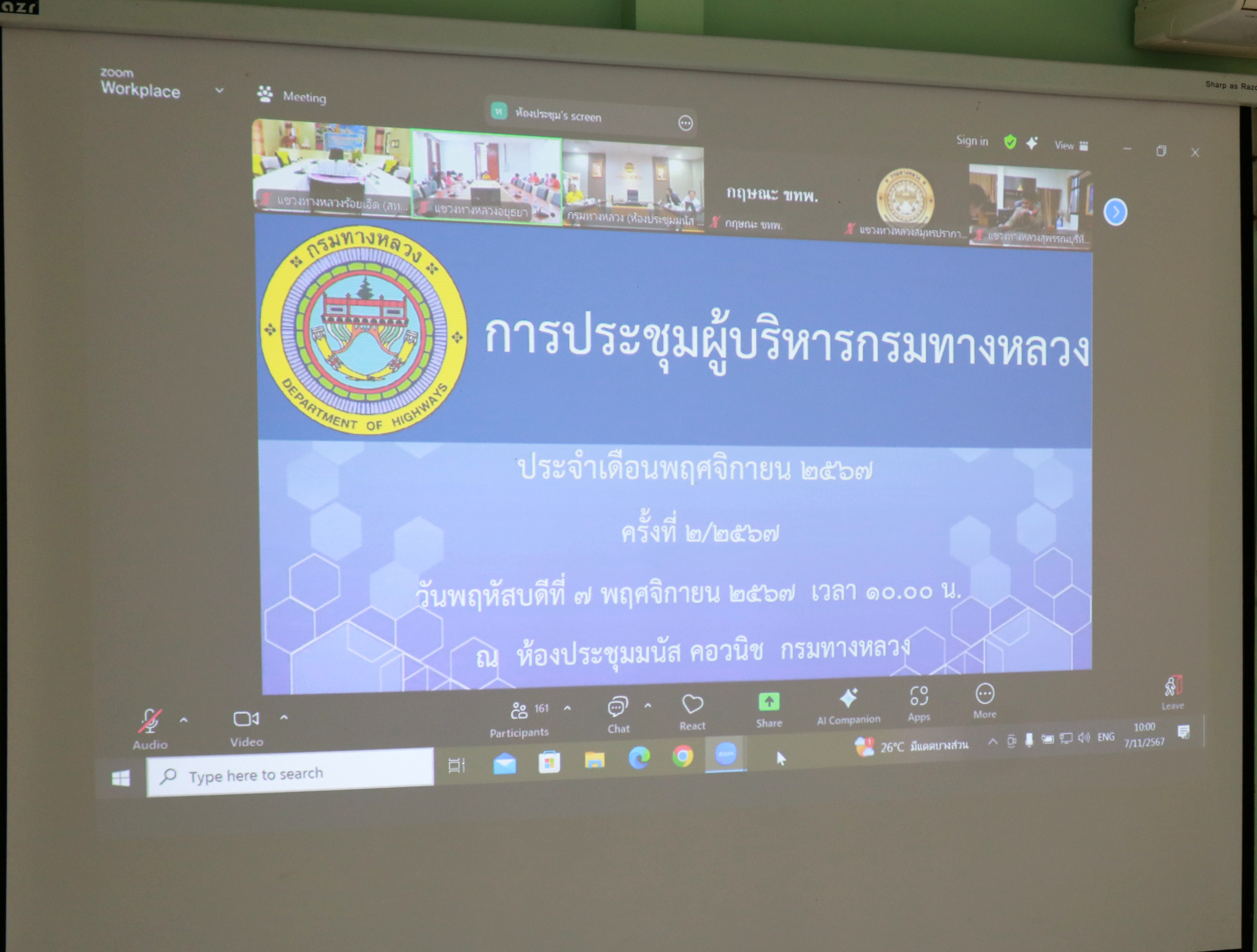 นายวุฒิพงศ์ คำภูแสน ผู้อำนวยการแขวงทางหลวงร้อยเอ็ด ,นายสถิต คำพิชิต รองผู้อำนวยแขวงทางหลวงร้อยเอ็ด ฝ่ายปฏิบัติการ ,นางรฐา ชำนาญยงค์ รองผู้อำนวยการแขวงทางหลวงร้อยเอ็ด ฝ่ายบริหาร และนางสาววิภาพร เกตุจังหาร เจ้าพนักงานการเงินและบัญชีชำนาญงาน ได้เข้าร่วมประชุมผู้บริหารกรมทางหลวง ประจำเดือนธันวาคม 2567 ครั้งที่ 3/2567 โดยมี นายอภิรัฐ ไชยวงศ์น้อย อธิบดีกรมทางหลวง เป็นประธานในการประชุม ณ ห้องประชุมมนัส คอวนิช กรมทางหลวง ผ่านสื่ออิเล็กทรอนิกส์แอปพลิเคชั่น Zoom Cloud Meeting ณ ห้องประชุมจุลละโพธิ แขวงทางหลวงร้อยเอ็ด