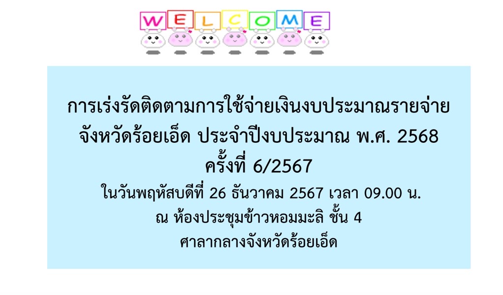 นายวุฒิพงศ์ คำภูแสน ผู้อำนวยการแขวงทางหลวงร้อยเอ็ด มอบหมายให้ นางสาววิภาพร เกตุจังหาร เจ้าพนักงานการเงินและบัญชีชำนาญงาน เข้าร่วมประชุมคณะกรรมการเร่งรัดติดตามการใช้จ่ายเงินงบประมาณรายจ่ายจังหวัดร้อยเอ็ด ประจำปีงบประมาณ พ.ศ. 2568 ครั้งที่ 6/2567 โดยมี นายชูศักดิ์ ราชบุรี รองผู้ว่าราชการจังหวัดร้อยเอ็ด เป็นประธานในการประชุม ณ ห้องประชุมข้าวหอมมะลิ ชั้น 4 ศาลากลางจังหวัดร้อยเอ็ด