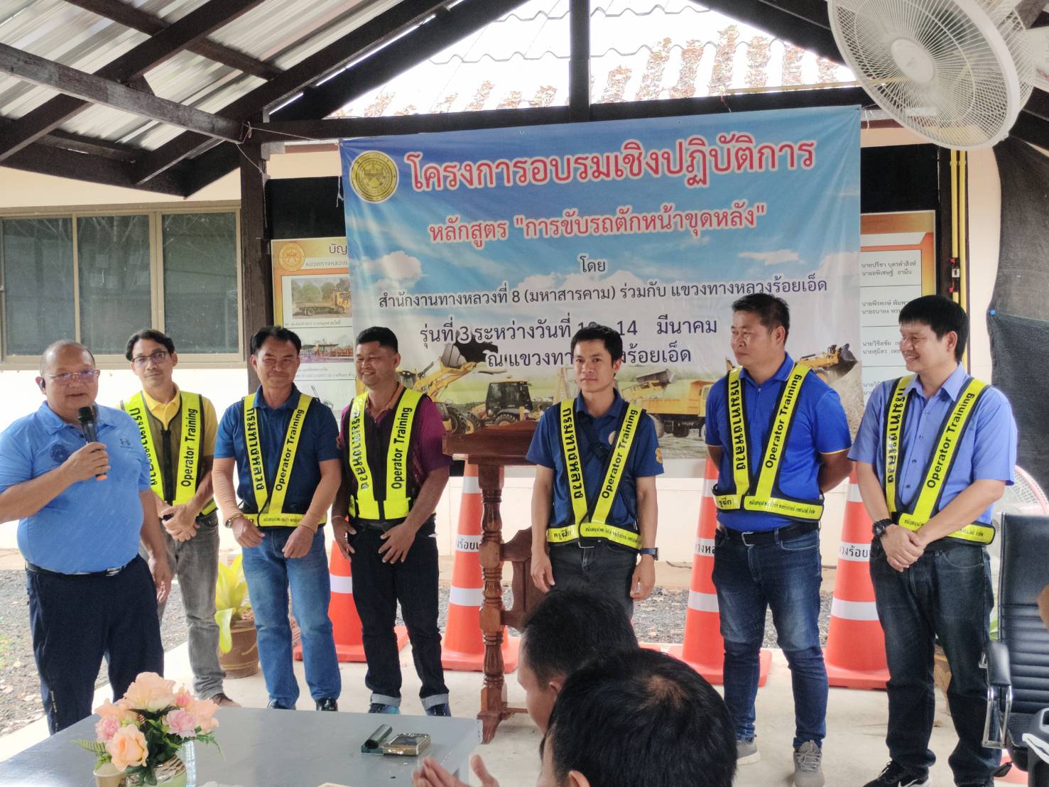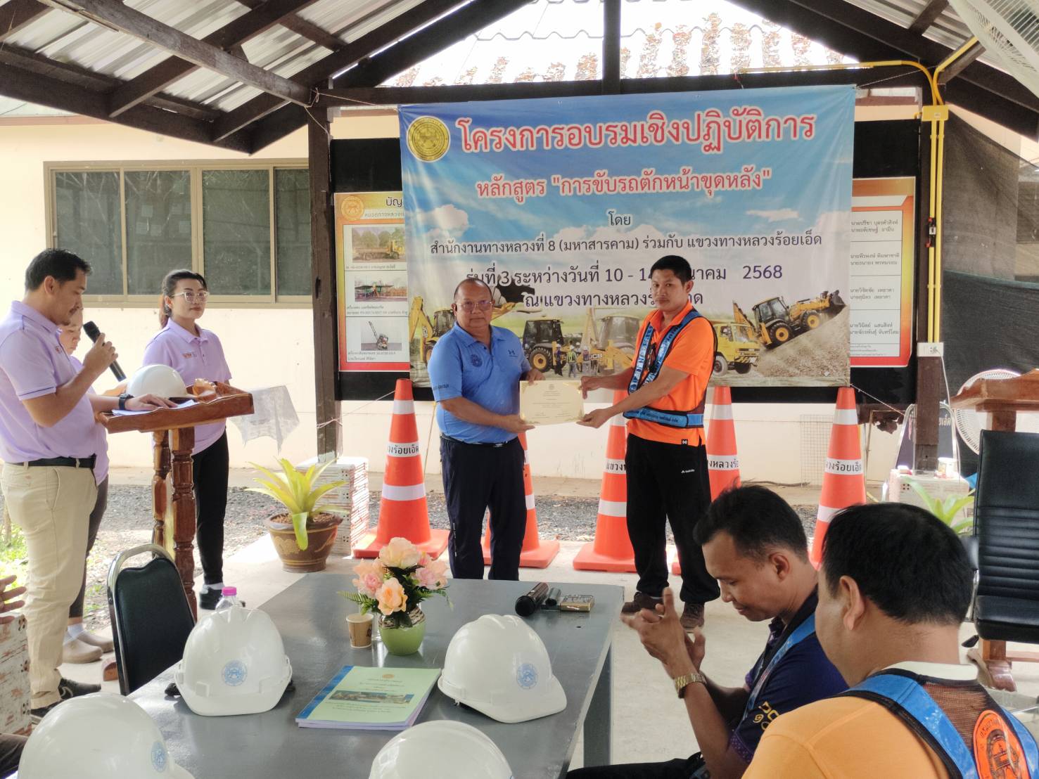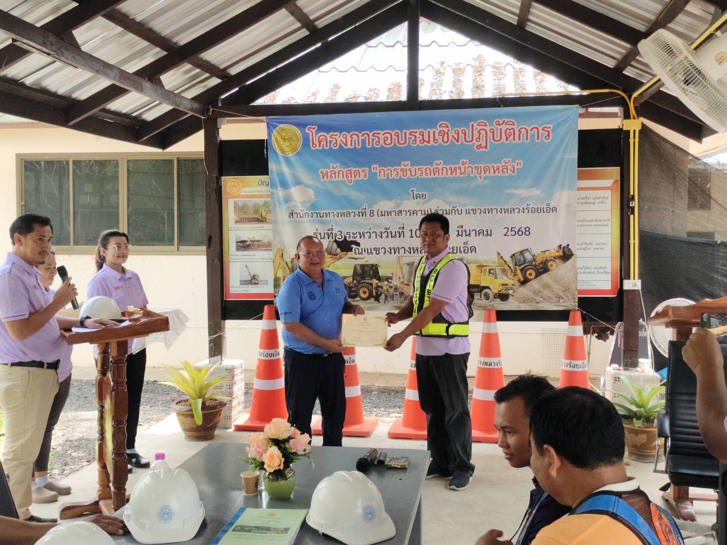 นายวุฒิพงศ์ คำภูแสน ผู้อำนวยการแขวงทางหลวงร้อยเอ็ด เป็นประธาน พิธีปิดโครงการอบรมเชิงปฏิบัติการหลักสูตร “การขับรถตักหน้าขุดหลัง” ระหว่าง วันที่ 10 – 14 มีนาคม 2568 พร้อมมอบวุฒิบัตรแก่ผู้เข้าร่วมฝึกอบรมฯและวิทยากร ณ หมวดทางหลวงเมืองสรวง แขวงทางหลวงร้อยเอ็ด
