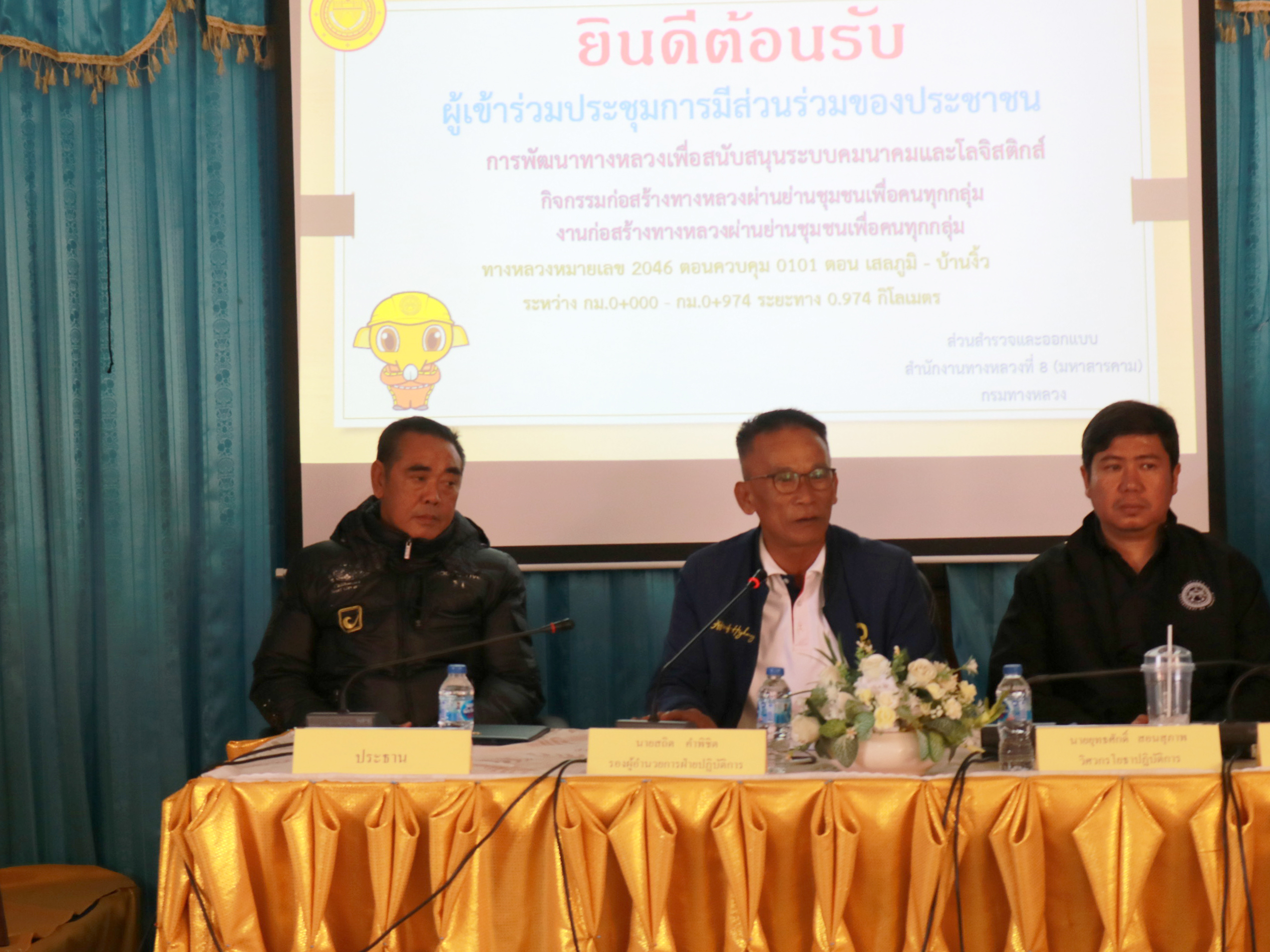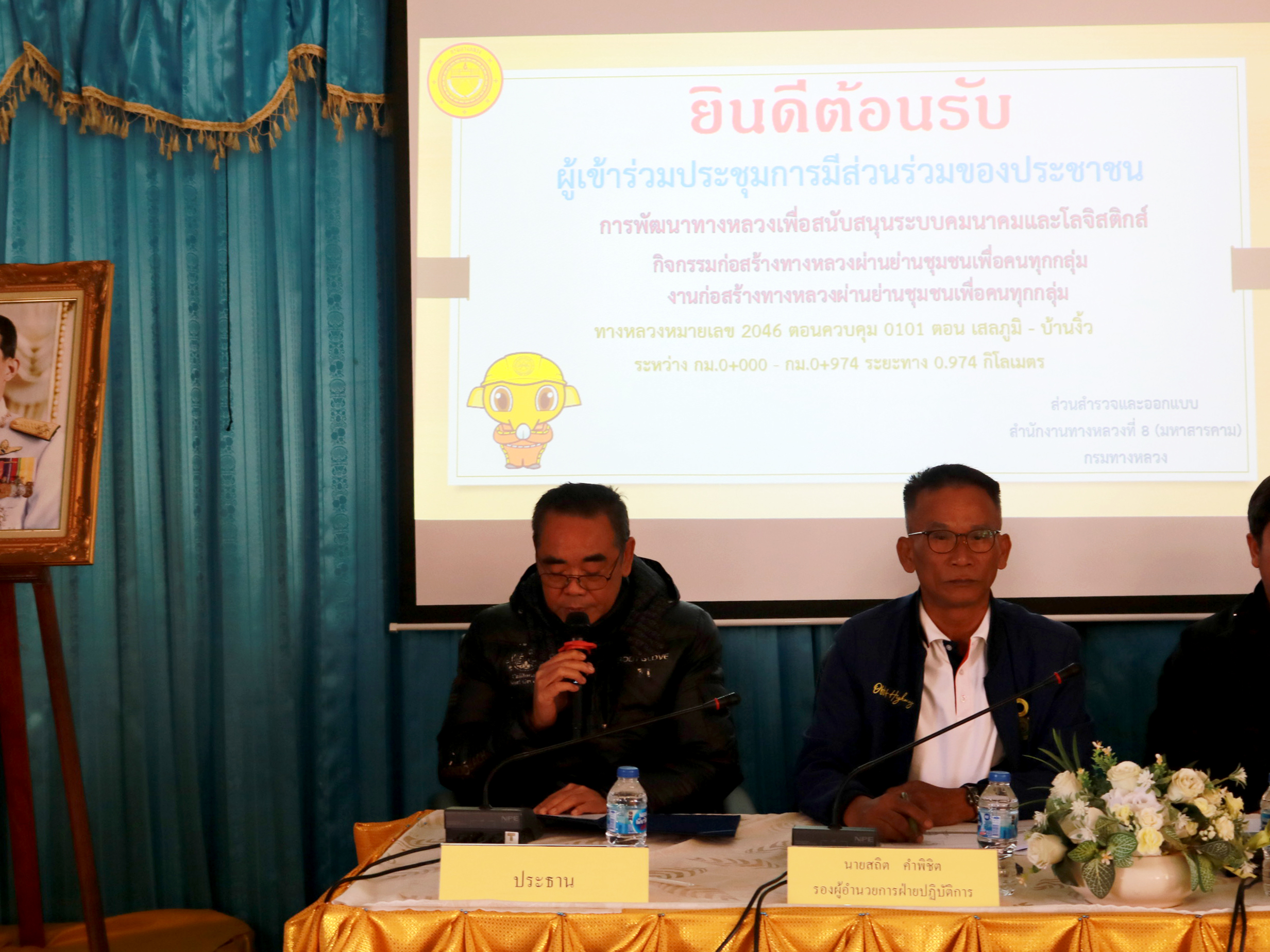 “ร่วมประชุมการมีส่วนร่วมของประชาชน เพื่อรับฟังความคิดเห็นของทุกภาคส่วน ในการดำเนินงานก่อสร้าง โครงการก่อสร้างโครงข่ายทางหลวงแผ่นดิน กิจกรรมก่อสร้างทางหลวงผ่านย่านชุมชน ทางหลวงหมายเลข 2046 ตอน เสลภูมิ - บ้านงิ้ว ระหว่าง กม.0+000 - กม.0+974”