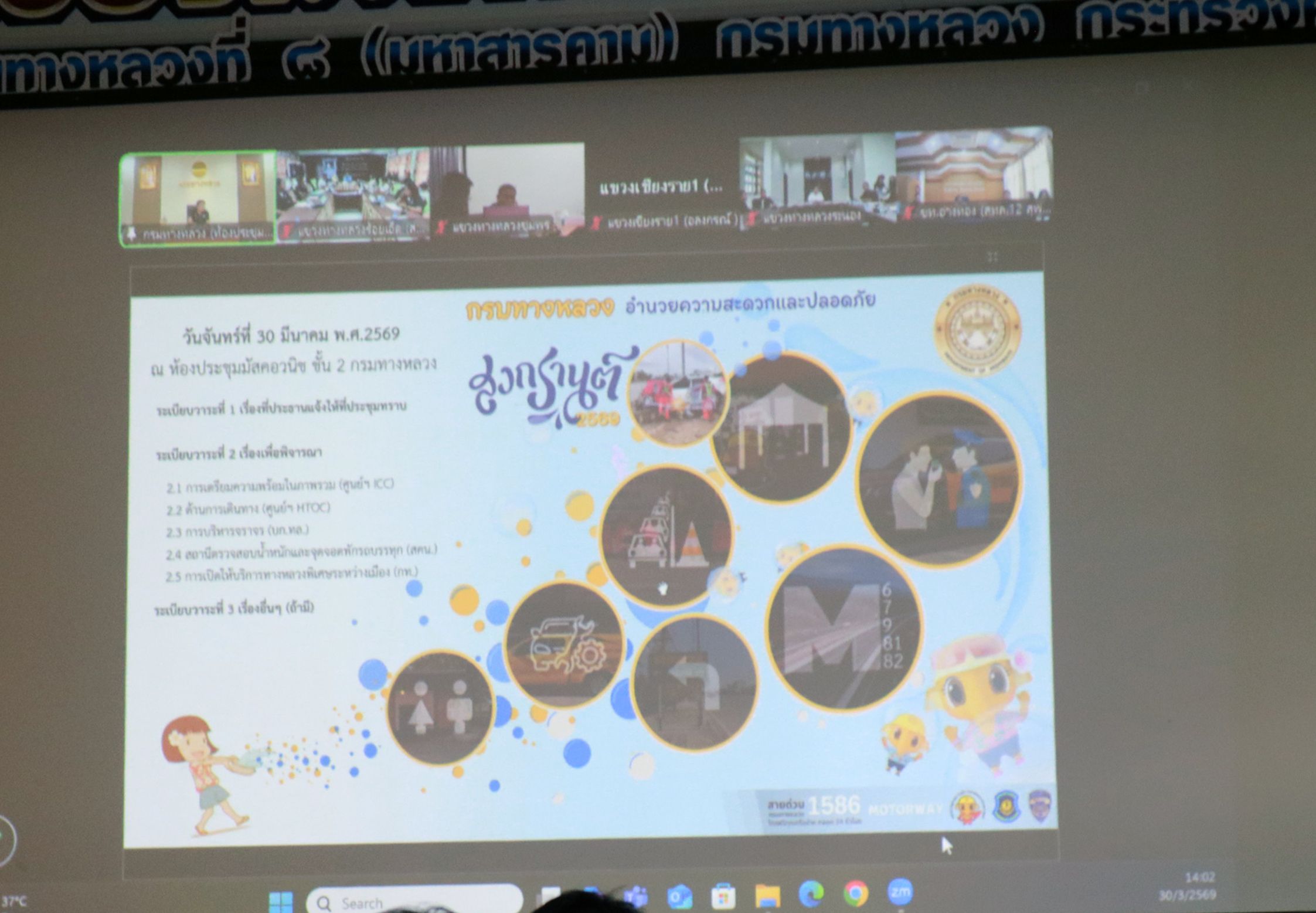 นายวุฒิพงศ์ คำภูแสน ผู้อำนวยการแขวงทางหลวงร้อยเอ็ด พร้อมด้วย รองผู้อำนวยการแขวงทางหลวงร้อยเอ็ด และเจ้าหน้าที่แขวงทางหลวงร้อยเอ็ด ได้เข้าร่วมประชุมการเตรียมความพร้อมการอำนวยความสะดวกและปลอดภัยช่วงเทศกาลสงกรานต์ปี 2569 โดยมี นายพงศกร จุลละโพธิ รองอธิบดีฝ่ายบำรุงทาง เป็นประธานในการประชุม ผ่านระบบ Application Zoom ณ ห้องประชุมจุลละโพธิ แขวงทางหลวงร้อยเอ็ด