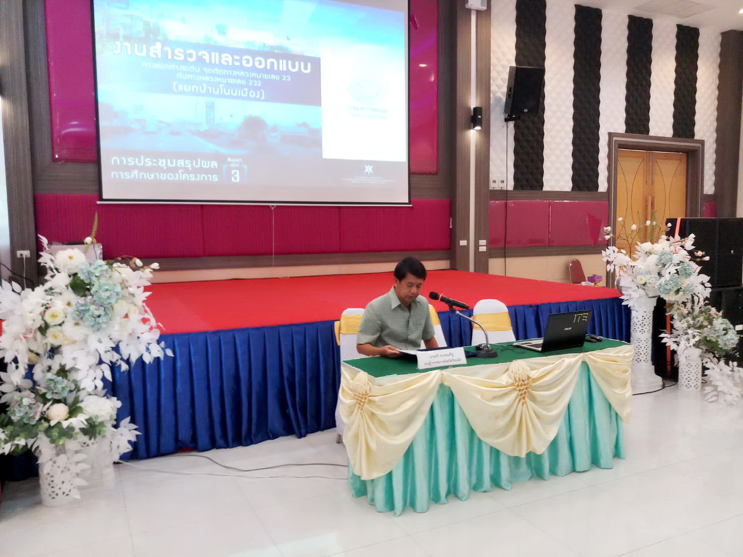 นายพงศกร จุลละโพธิ ผู้อำนวยการแขวงทางหลวงร้อยเอ็ด ร่วมกับสำนักสำรวจและออกแบบ กรมทางหลวง และคณะเจ้าหน้าที่จากส่วนราชการต่างๆ ภายในจังหวัดร้อยเอ็ด รวมทั้งผู้มีส่วนเกี่ยวข้องทุกภาคส่วน ร่วมประชุมสรุปผลการการศึกษาของโครงการทางแยกต่างระดับจุดตัดทางหลวงหมายเลข 23 กับทางหลวงหมายเลข 232 (แยกบ้านโนนเมือง) ครั้งที่ 3 พร้อมรับฟังความคิดเห็นและข้อเสนอแนะ จากผู้เข้าร่วมประชุม ณ ห้องประชุมจตุรพักตร์พิมาน โรงแรมวันโอวัน ตำบลรอบเมือง อำเภอเมือง จังหวัดร้อยเอ็ด