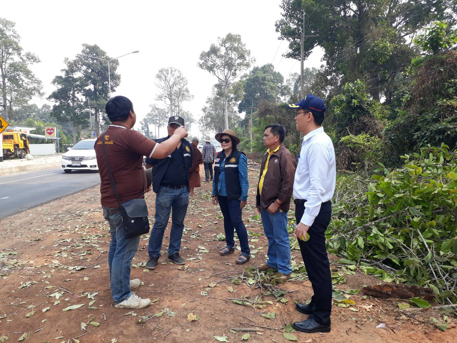 นายเกียรติพงษ์ เจียรนัยธนะกิจ ผู้อำนวยการแขวงทางหลวงร้อยเอ็ด พร้อมด้วยนายสมัย คะนะมะ รองผู้อำนวยการแขวงทางหลวงร้อยเอ็ด ฝ่ายวิศวกรรม ,นายสถิต คำพิชิต รองผู้อำนวยการแขวงทางหลวงร้อยเอ็ด ฝ่ายปฏิบัติการ ร่วมตรวจงานตัดต้นไม้ที่กีดขวางงานก่อสร้าง โครงการเพิ่มประสิทธิภาพทางหลวง ในทางหลวงหมายเลข 215 ตอน ร้อยเอ็ด - สุวรณภูมิ ระหว่าง กม.2+300 - กม.4+800
