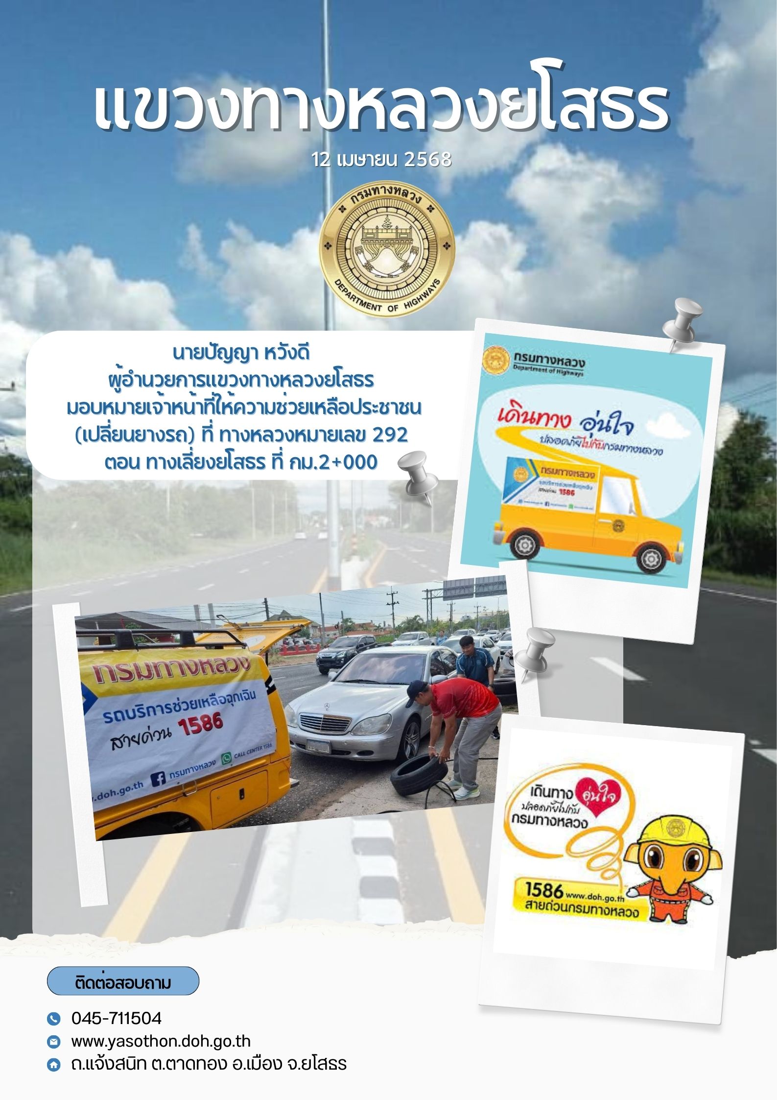 เจ้าหน้าที่ให้ความช่วยเหลือประชาชน (เปลี่ยนยางรถ) ที่ ทางหลวงหมายเลข 292 ตอน ทางเลี่ยงยโสรร ที่ กม.2+000