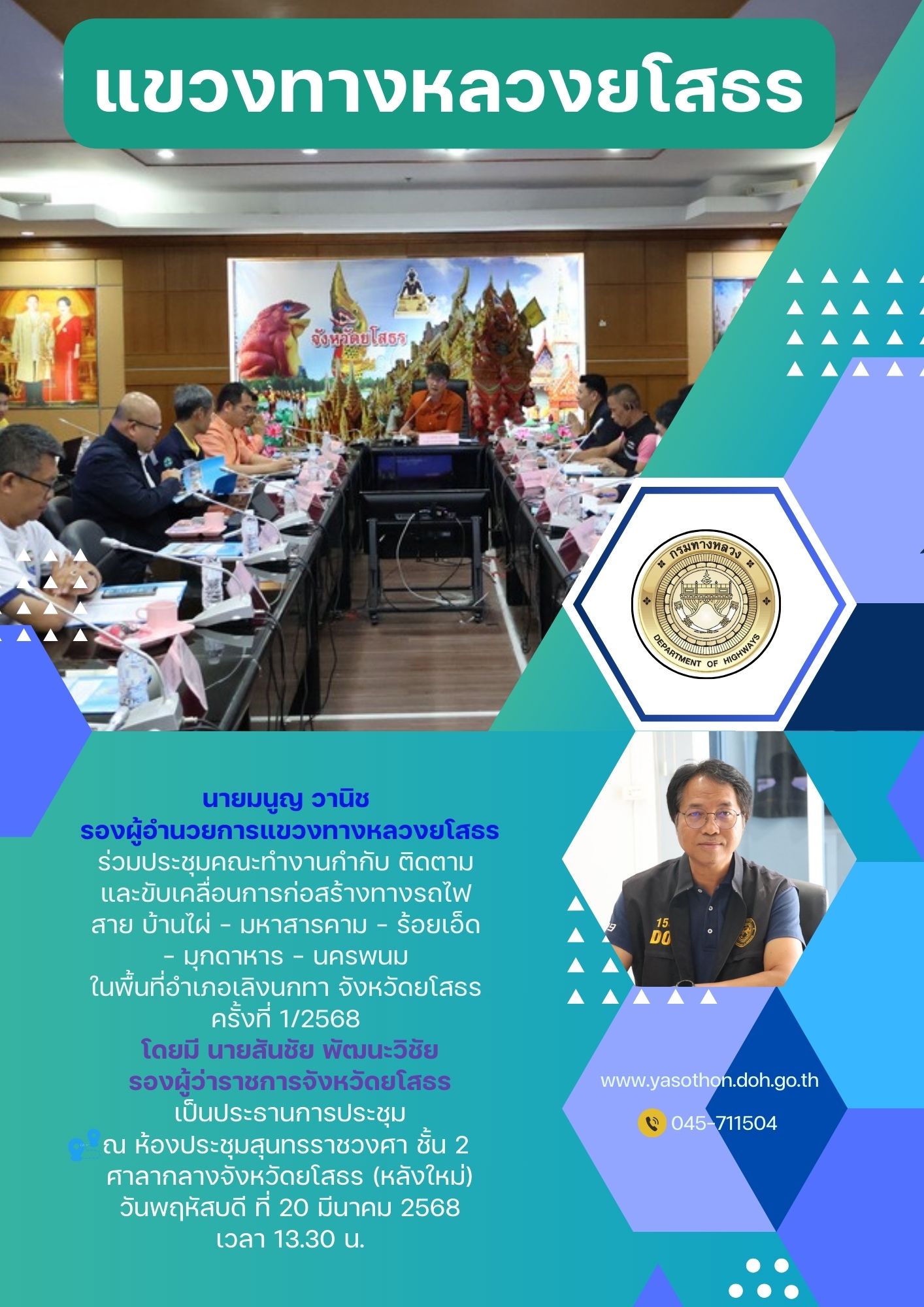 164 21/03/2568 ประชุมคณะทำงานกำกับ ติดตามและขับเคลื่อนการก่อสร้างทางรถไฟ สาย บ้านไผ่ - มหาสารคาม - ร้อยเอ็ด - มุกดาหาร - นครพนม ในพื้นที่อำเภอเลิงนกทา จังหวัดยโสธร ครั้งที่ 1/2568