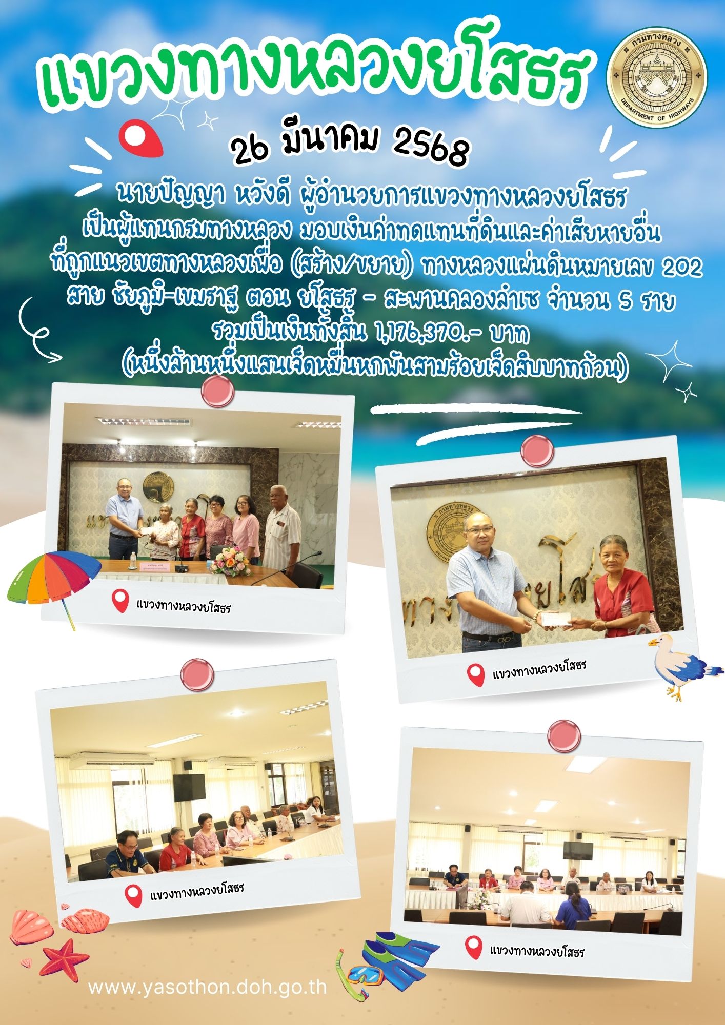 159 26/03/2568 เป็นผู้แทนกรมทางหลวง มอบเงินค่าทดแทนที่ดินและค่าเสียหายอื่น ที่ถูกแนวเขตทางหลวงเพื่อ (สร้าง/ขยาย)