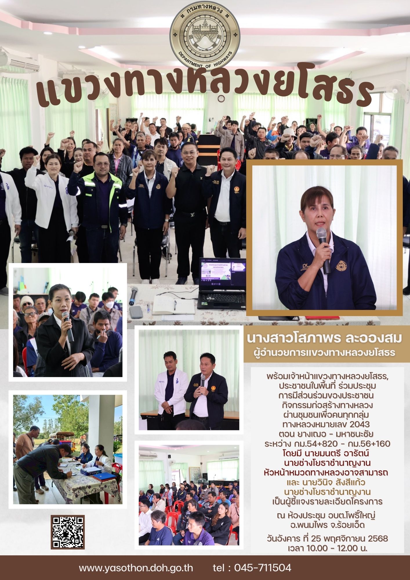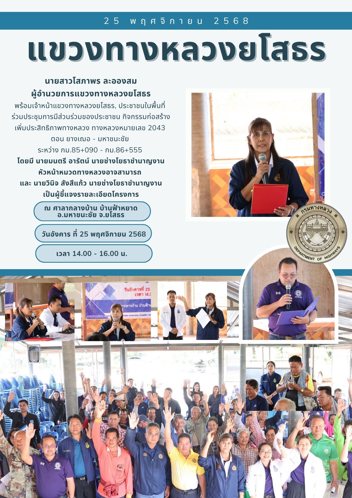 ร่วมประชุมการมีส่วนร่วมของประชาชน กิจกรรมก่อสร้างทางหลวง ผ่านชุมชนเพื่อคนทุกกลุ่ม ทางหลวงหมายเลข 2043 ตอน ยางเฌอ - มหาชนะชัย ระหว่าง กม.54+820 - กม.56+160