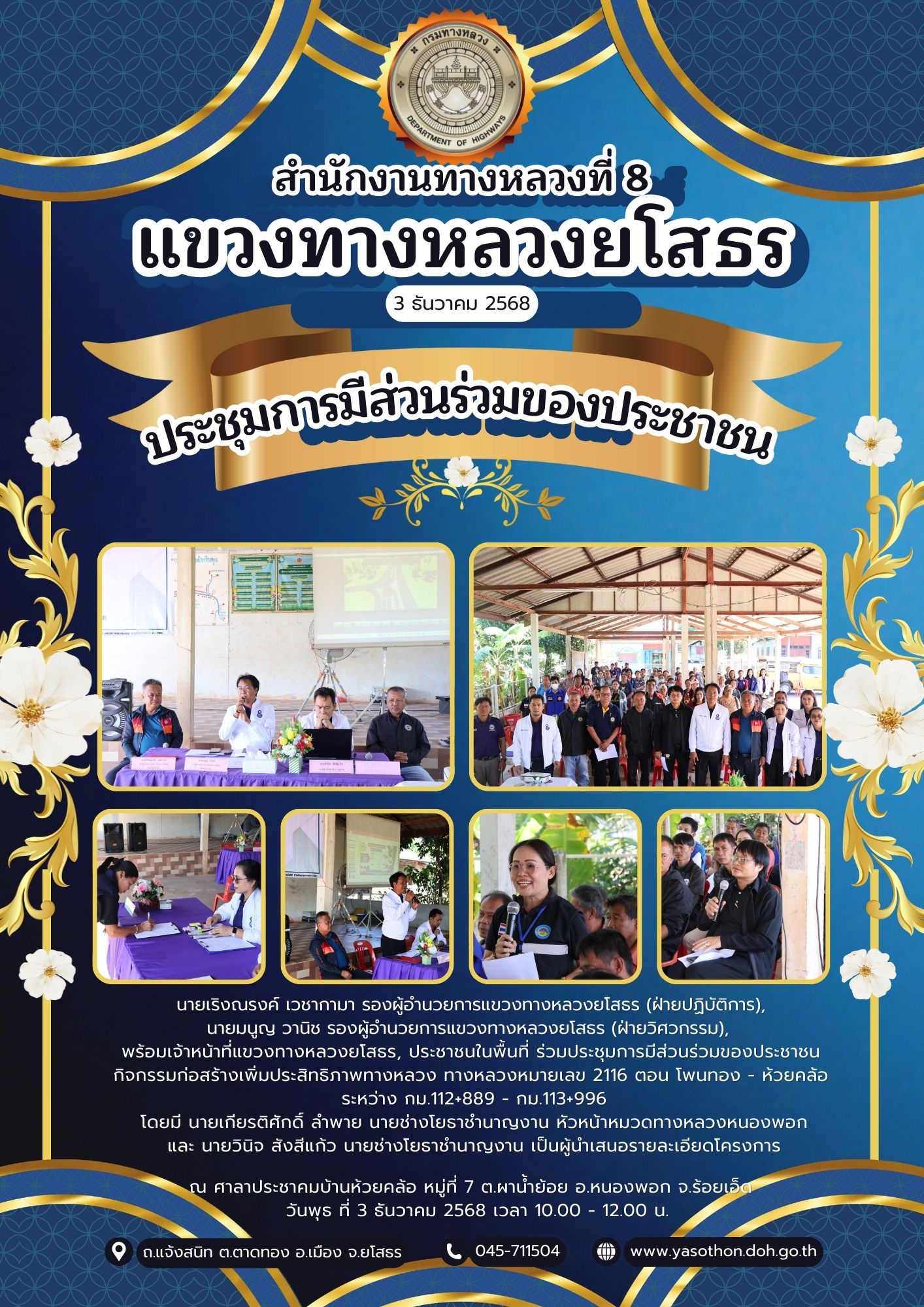 ประชุมการมีส่วนร่วมของประชาชน กิจกรรมก่อสร้างเพิ่มประสิทธิภาพทางหลวง ทางหลวงหมายเลข 2116 ตอน โพนทอง - ห้วยคล้อ ระหว่าง กม.112+889 - กม.113+996