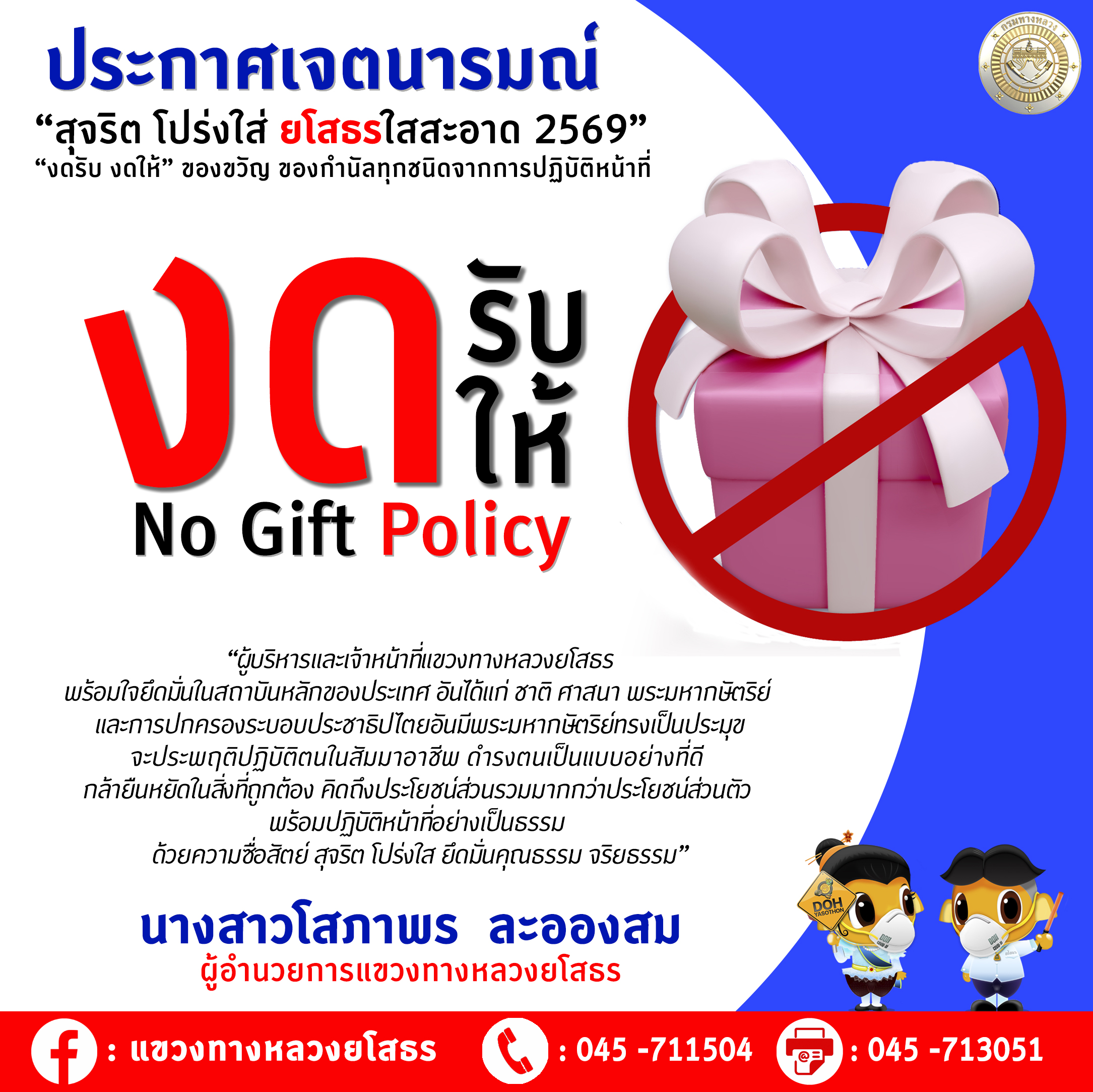 “สุจริต โปร่งใส ยโสธรใสสะอาด 2569” และ “งดรับ งดให้” ของขวัญ ของกำนัลทุกชนิดจากการปฏิบัติหน้าที่ (No Gift Policy)