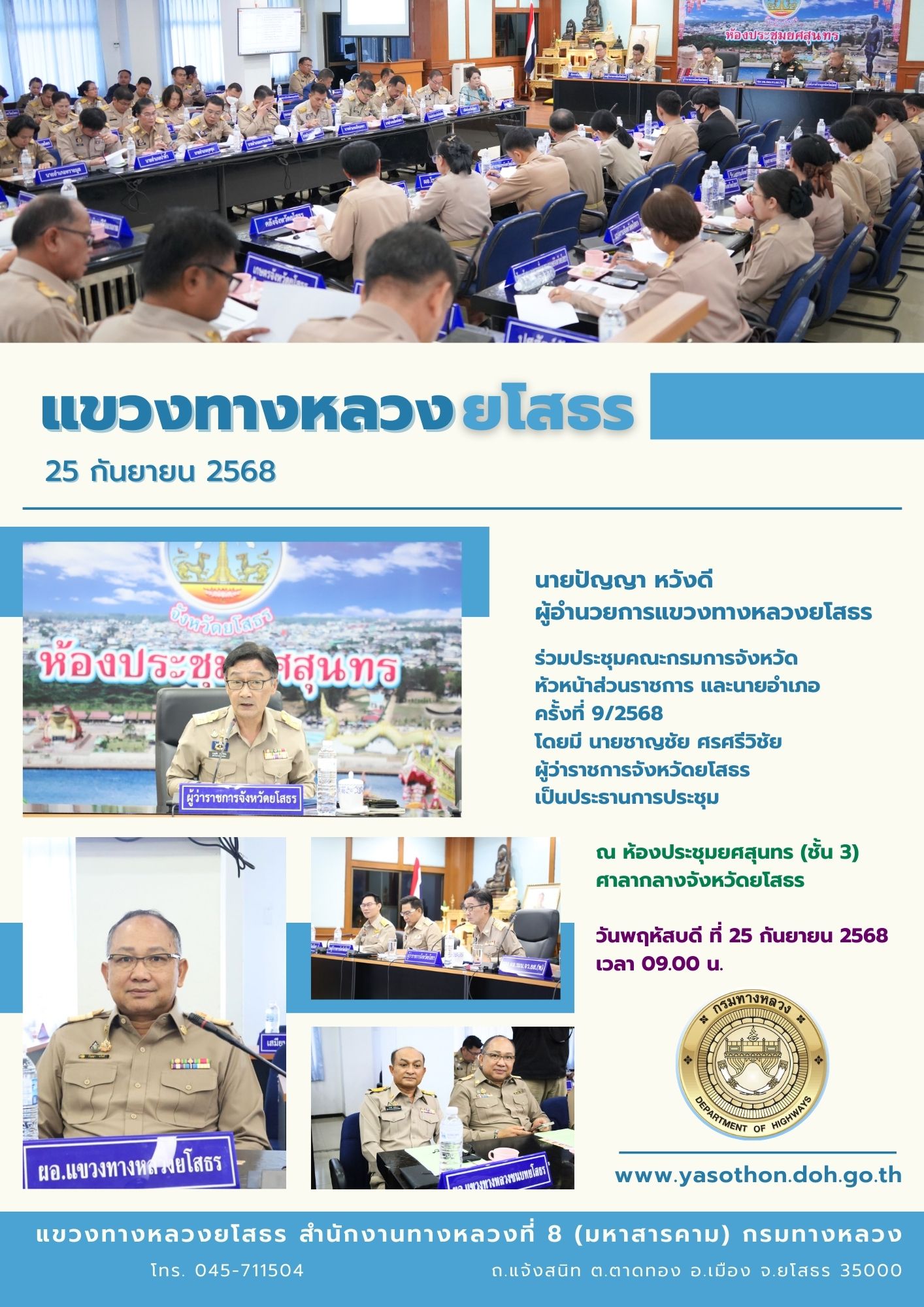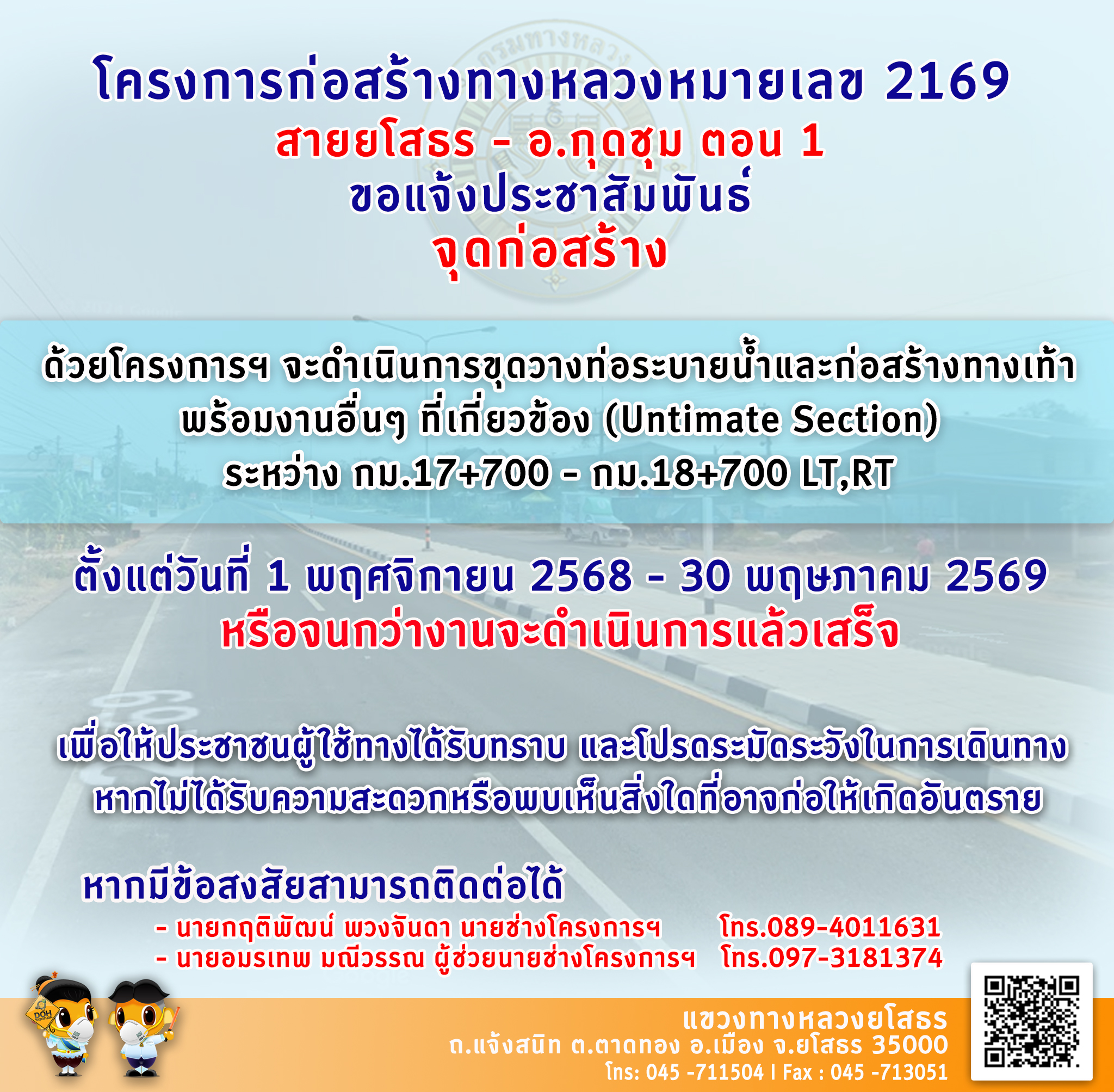 38 20/10/2568 แจ้งประชาสัมพันธ์ การดำเนินการก่อสร้าง ในทางหลวง 2169 สายยโสธร - กุดชุม ตอน 1
