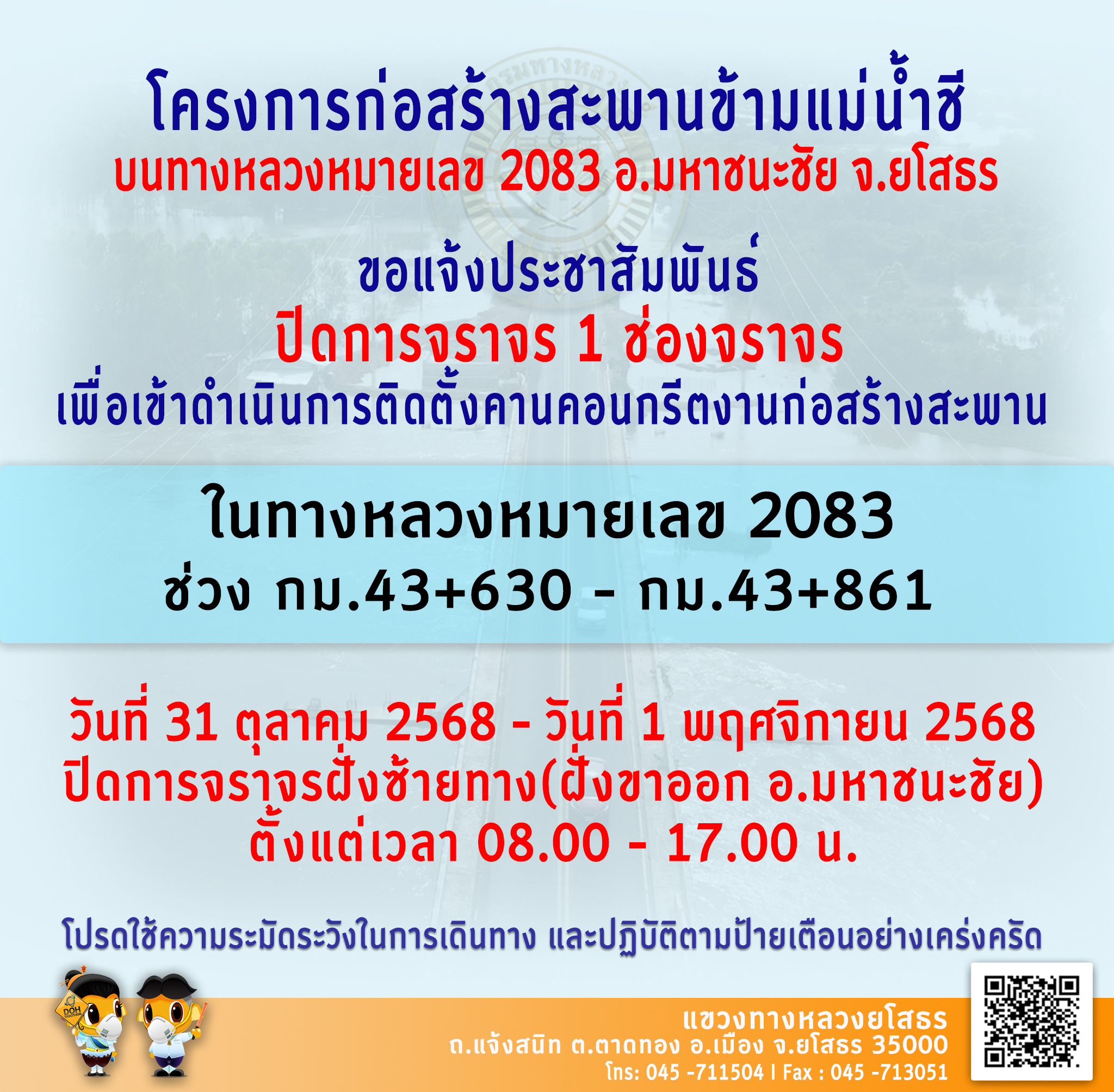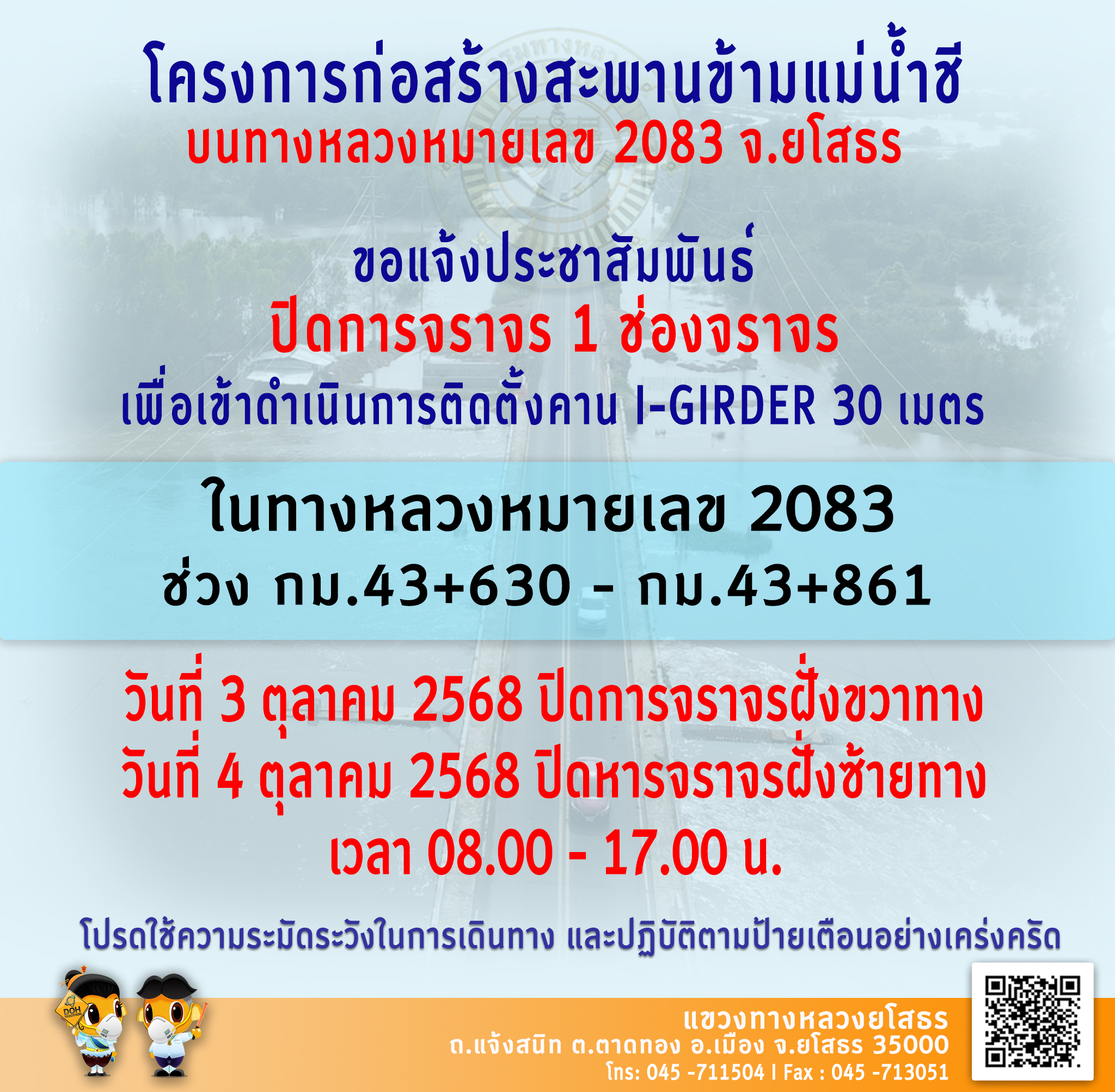 42 30/09/2568 ??ปิดการจราจร 1 ช่องทาง?? โครงการก่อสร้างสะพานข้ามแม่น้ำชี ทางหลวงหมายเลข 2083 ระหว่าง กม.43+630 - กม.43+861